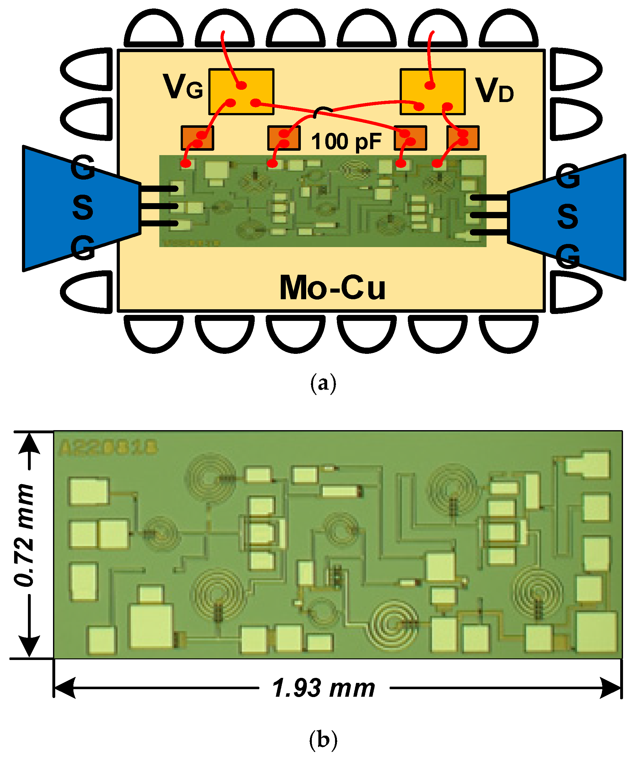 - Li, J.; Yuan, Y.; Zeng, J.; He, D.; Yu, Z. A Broadband LNA With Multiple Bandwidth Enhancement Techniques. IEEE Microw. Wirel. Technol. Lett. 2023, 33, 551–554. [Google Scholar] [CrossRef]