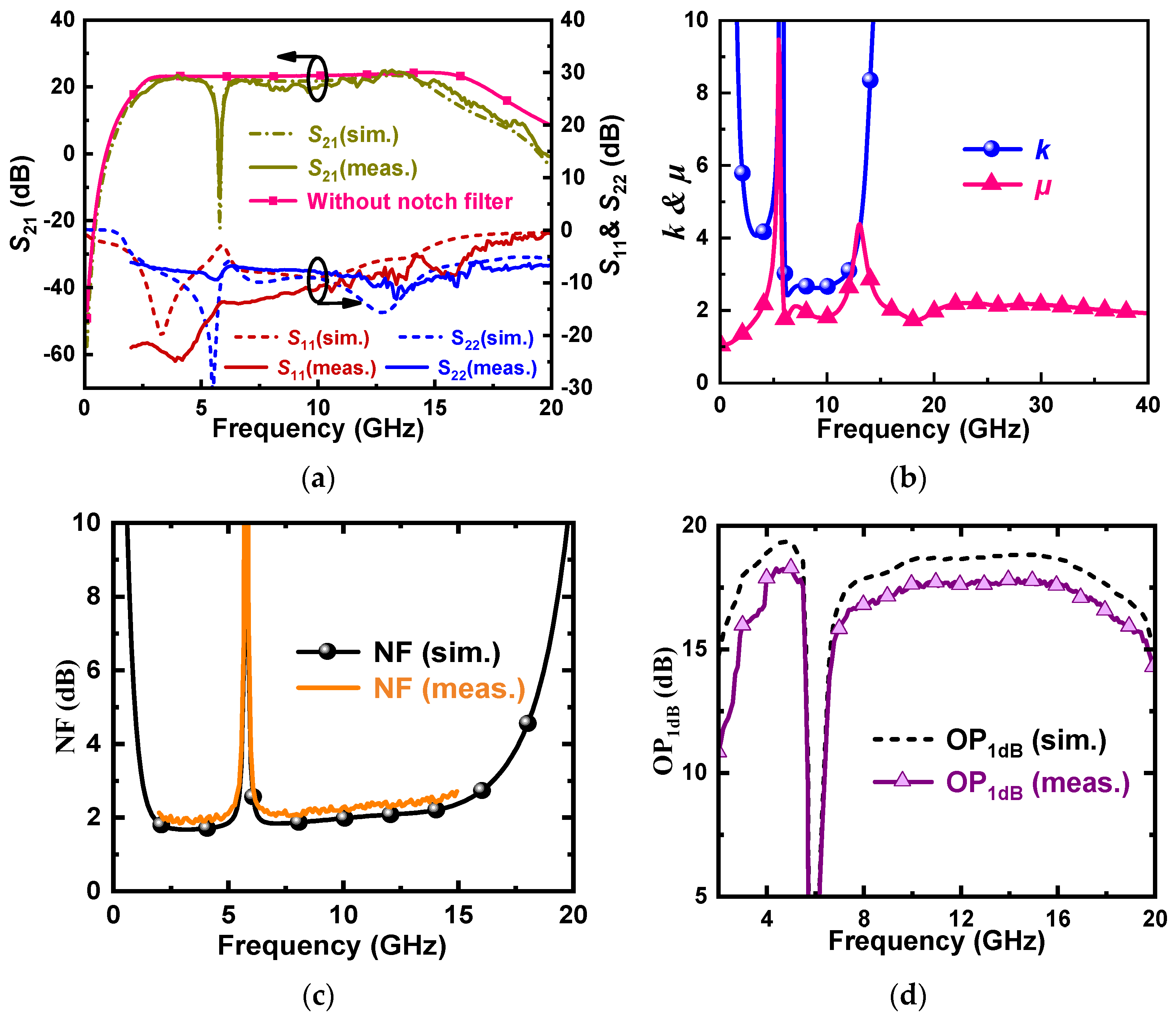 - Xie, H.; Cheng, Y.J.; Fan, Y. A K-band high interference-rejection GaAs low-noise amplifier using multizero control method for satellite communication. IEEE Microw. Wirel. Compon. Lett. 2020, 30, 1069–1072. [Google Scholar] [CrossRef]