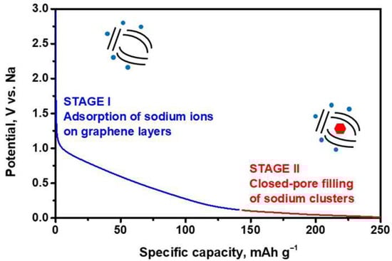 Storage of sodium in carbonaceous materials can proceed through different mechanisms. The sodium initially inserted into the carbon at a high voltage possesses ionic character. Below 0.1 V vs. Na+/Na, formation of quasi-metallic clusters of Na has been observed in disordered carbons possessing microporosity [66,67]. For the intercalation of sodium ions between graphene layers in hard carbon, the interlayer spacing must be slightly larger than 3.6 Å [68], whereas “intercalation” for graphene interlayer spacings greater than 4.0 Å should be considered an adsorption process [69]. The presence of quasimetallic Na on the electrodes can be confirmed through a straightforward chemical test: immersing the reduced carbon electrode in ethanol with phenolphthalein results in a red color change and the evolution of H2 gas, indicative of reactive sodium species [70]. Pair distribution function analysis of neutron scattering data unveiled a diameter for the sodium clusters of approximately 13–15 Å [71]. Hard carbons with abundant closed pores exhibit a larger capacity for filling these pores with sodium in a quasi-metallic state (Figure 2) [72,73,74,75].