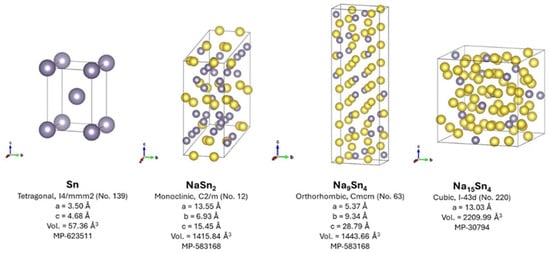 Crystal structures for tin and sodium-tin intermetallics obtained from the Materials Project database [106].
