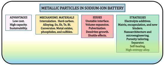 Developing new batteries for renewable energy storage is a serious need. Since sodium is abundant and not costly, SIBs can be handy for a modern and sustainable society [1,2]. On the other hand, since Li can form alloys with Al, but Na does not, SIBs are compatible with low-cost aluminum foils as current collectors, compared to lithium ones that typically employ expensive copper foil at the negative electrode. Although sodium metal has a very high theoretical capacity (1166 mAh g−1) and low redox potential (−2.71 V vs. SHE), it is not usually employed in its elemental state as a negative electrode in a battery. The main drawbacks of metallic Na as an anode are an unstable surface, uneven Na deposition, and the risk of dendrite growth, which can lead to capacity fade and the battery’s failure. However, sodium atoms can be chemically combined with metallic and non-metallic elements to provide a more suitable electrode material. The reactions for sodium storage in electrode materials can be classified into three types: intercalation, alloying, and conversion. The last two of those involve metals and/or alloys. Table 1 summarizes the most relevant electrode materials for SIBs, categorized according to their respective reaction mechanisms as discussed in this review. SIBs are most often based on the intercalation of sodium cations into oxides and other compounds. However, metals and alloys are also intimately linked to many of the most promising SIBs. Recent advances in metallic particles for SIBs, along with strategies for their optimization, are summarized in this review. Pure metals, intermetallics, and alloys can be initially employed as electrode materials in SIBs. The sodiophilic metallic elements that have been typically employed in SIBs are in Groups 14, 15, and 16 of the Periodic Table: Sn, Sb, Te, Pb, and Bi. Interestingly, metallic nanoparticles can be in situ formed during the charge/discharge of the battery. For example, controlling the formation of clusters of sodium atoms, with quasimetallic character, in sodiated carbon is highly relevant for developing SIBs.