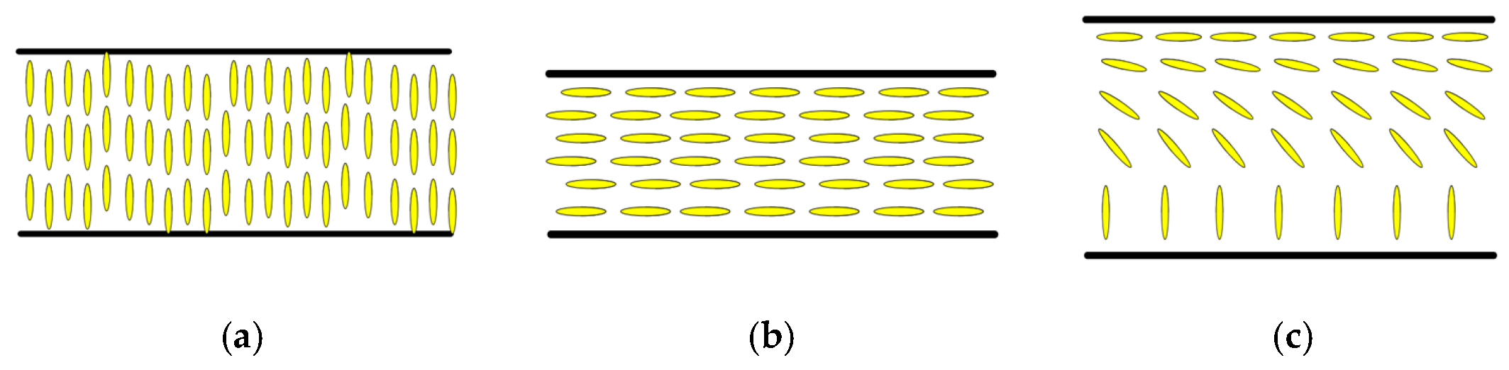 24]. These emerging material platforms reinforce the broader theme of this work: that manipulating orientational order, whether in traditional LCs or advanced hybrid systems, enables precise control of optical properties and opens pathways for next-generation photonic applications.