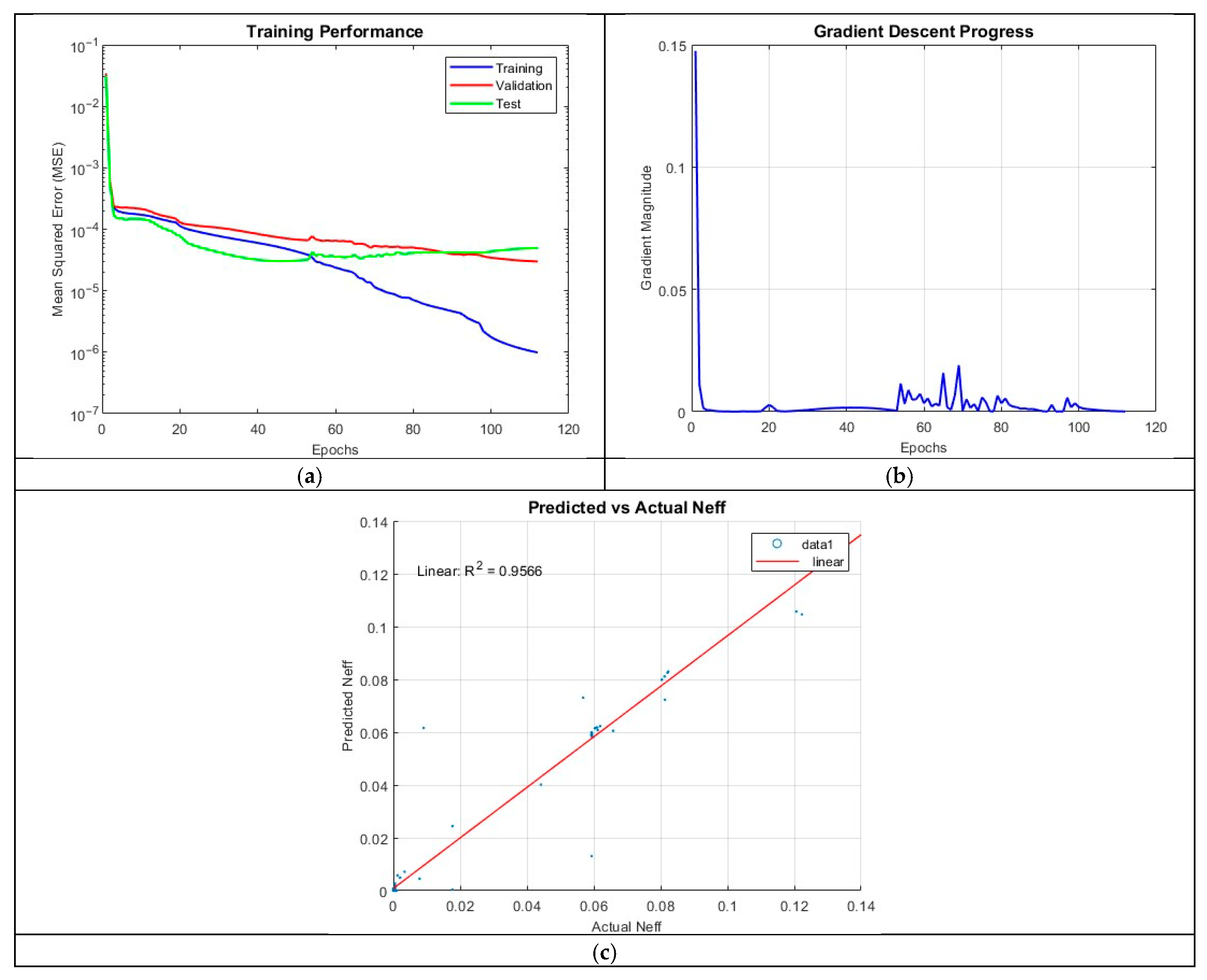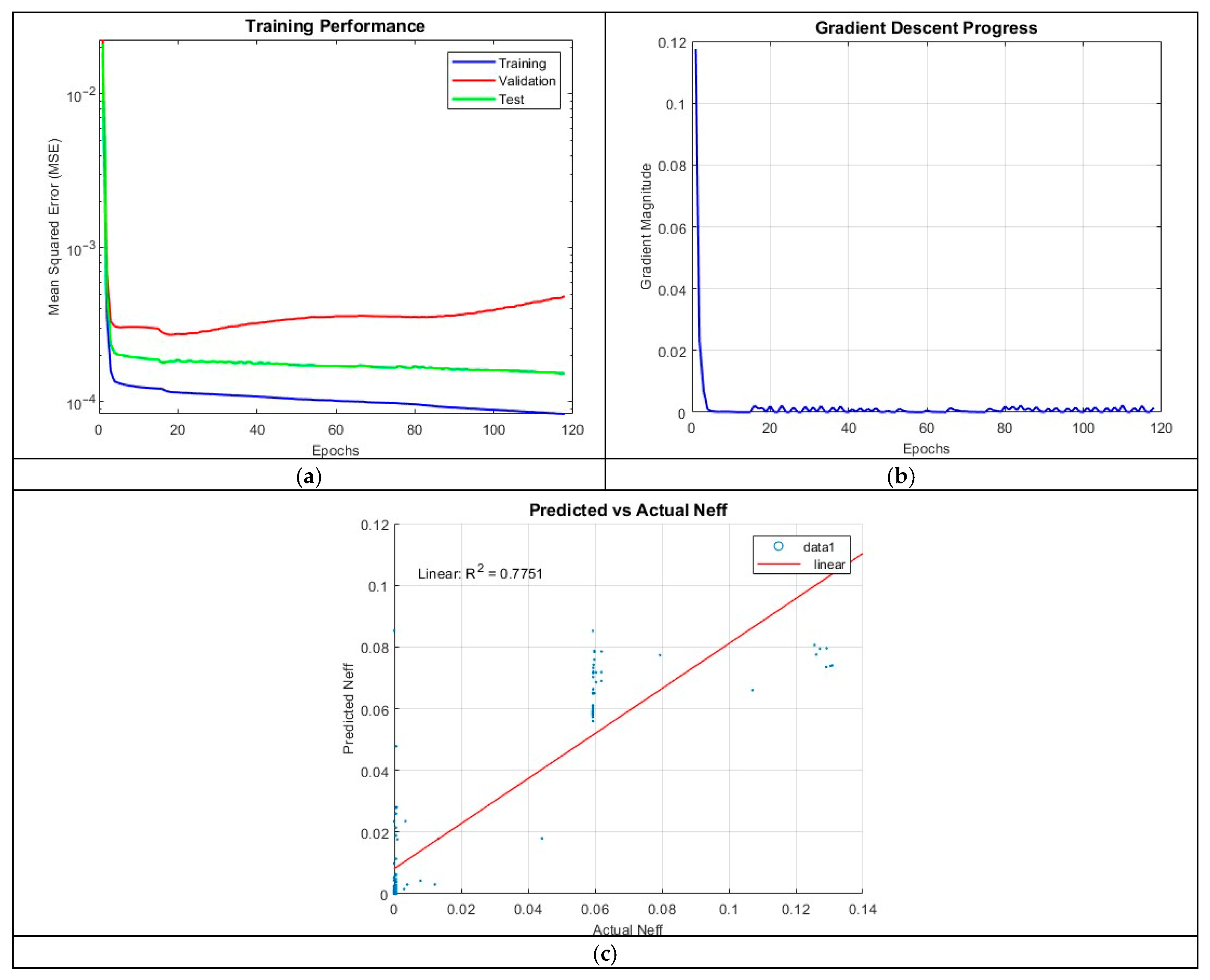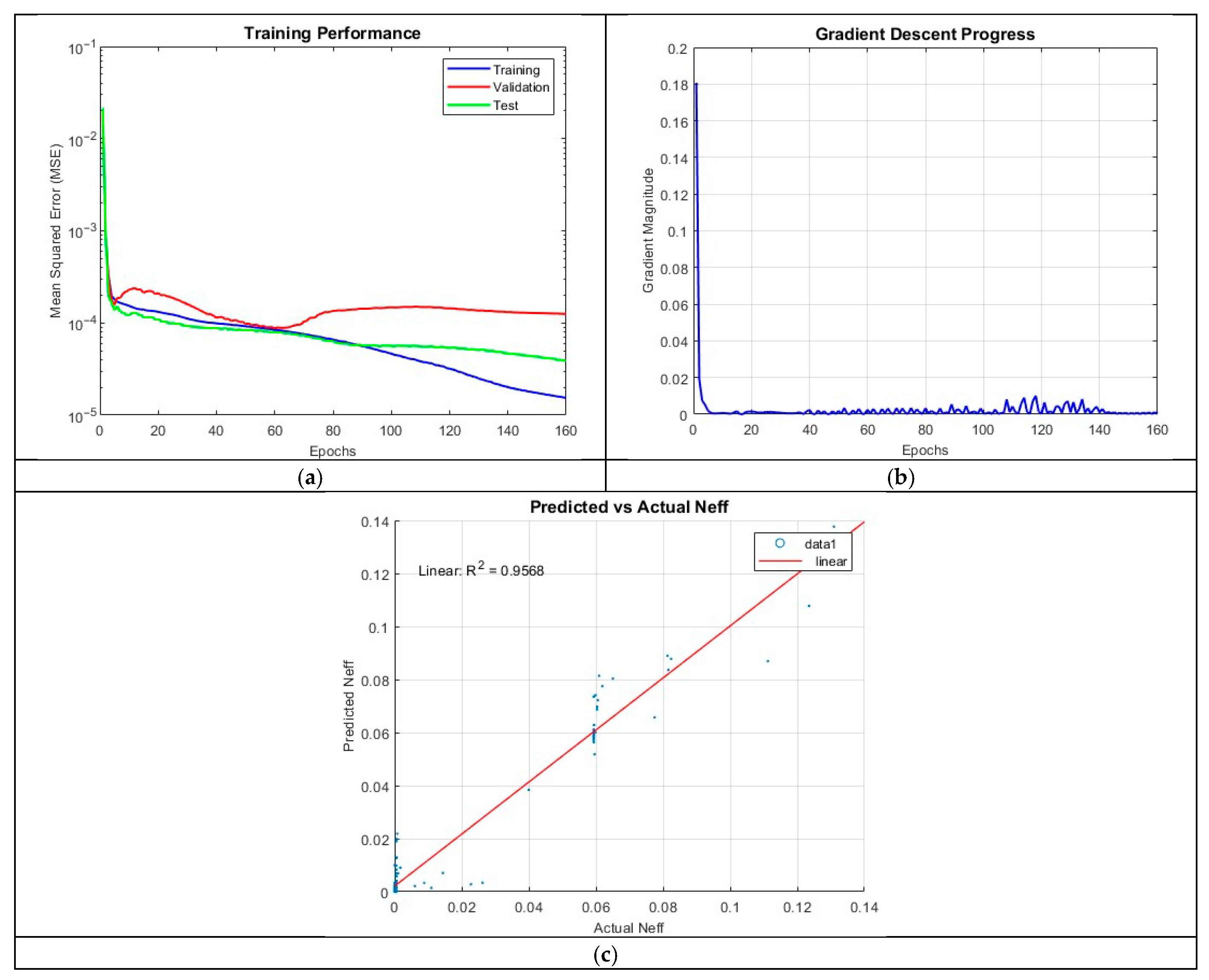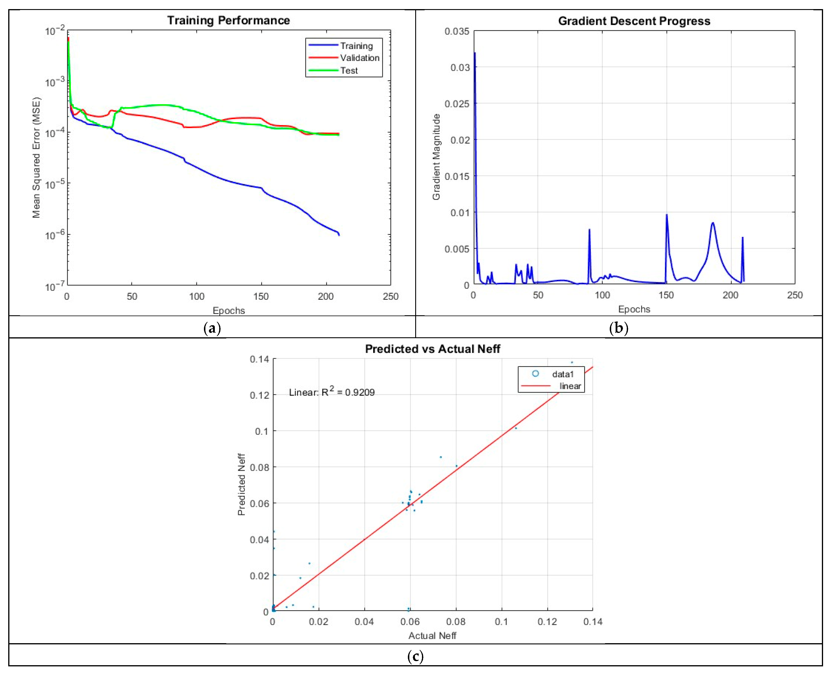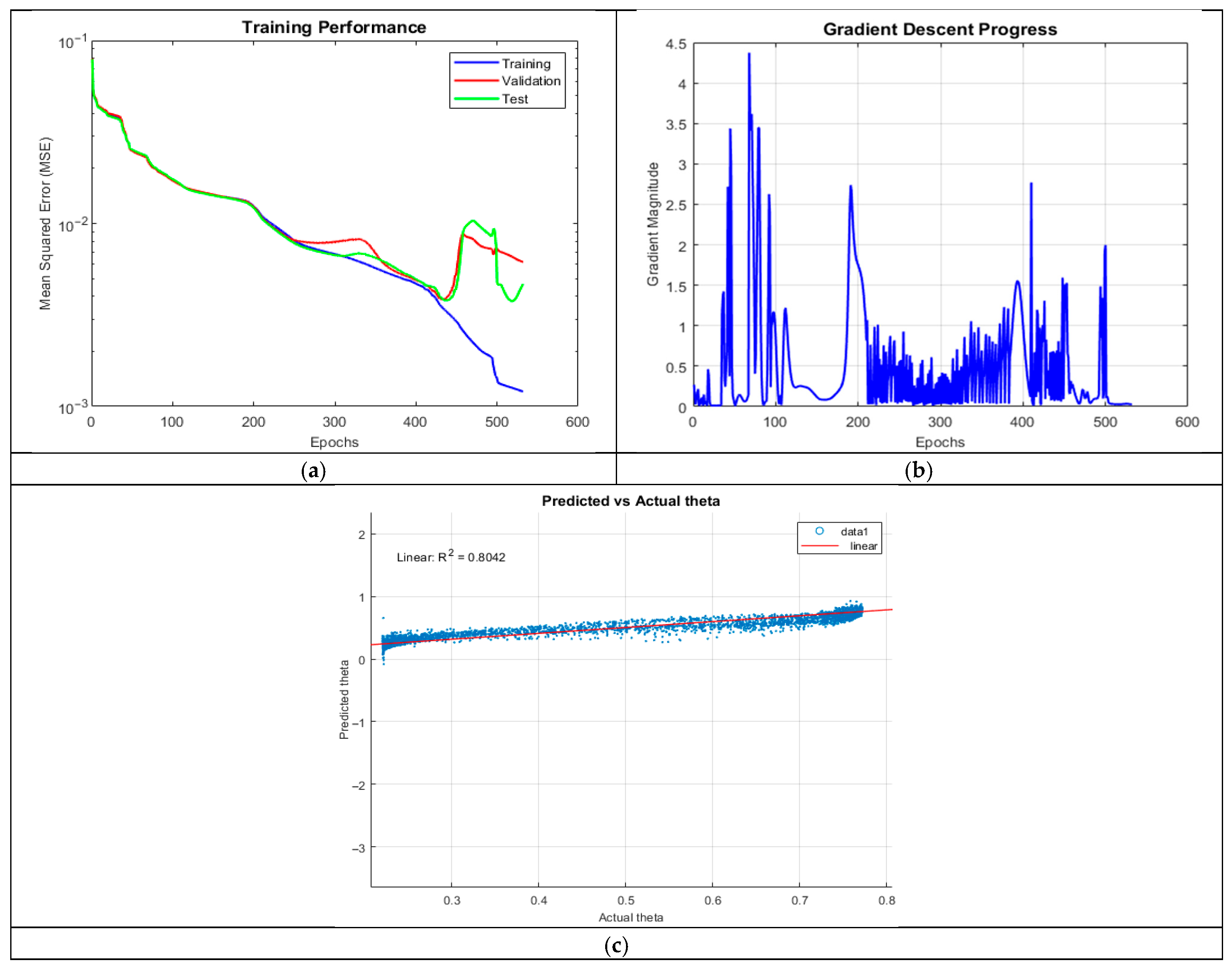 Training outputs of ANN_B5: (a) performance measuring the MSE; (b) magnitude of the gradient through training; (c) comparison between the predicted and actual values.