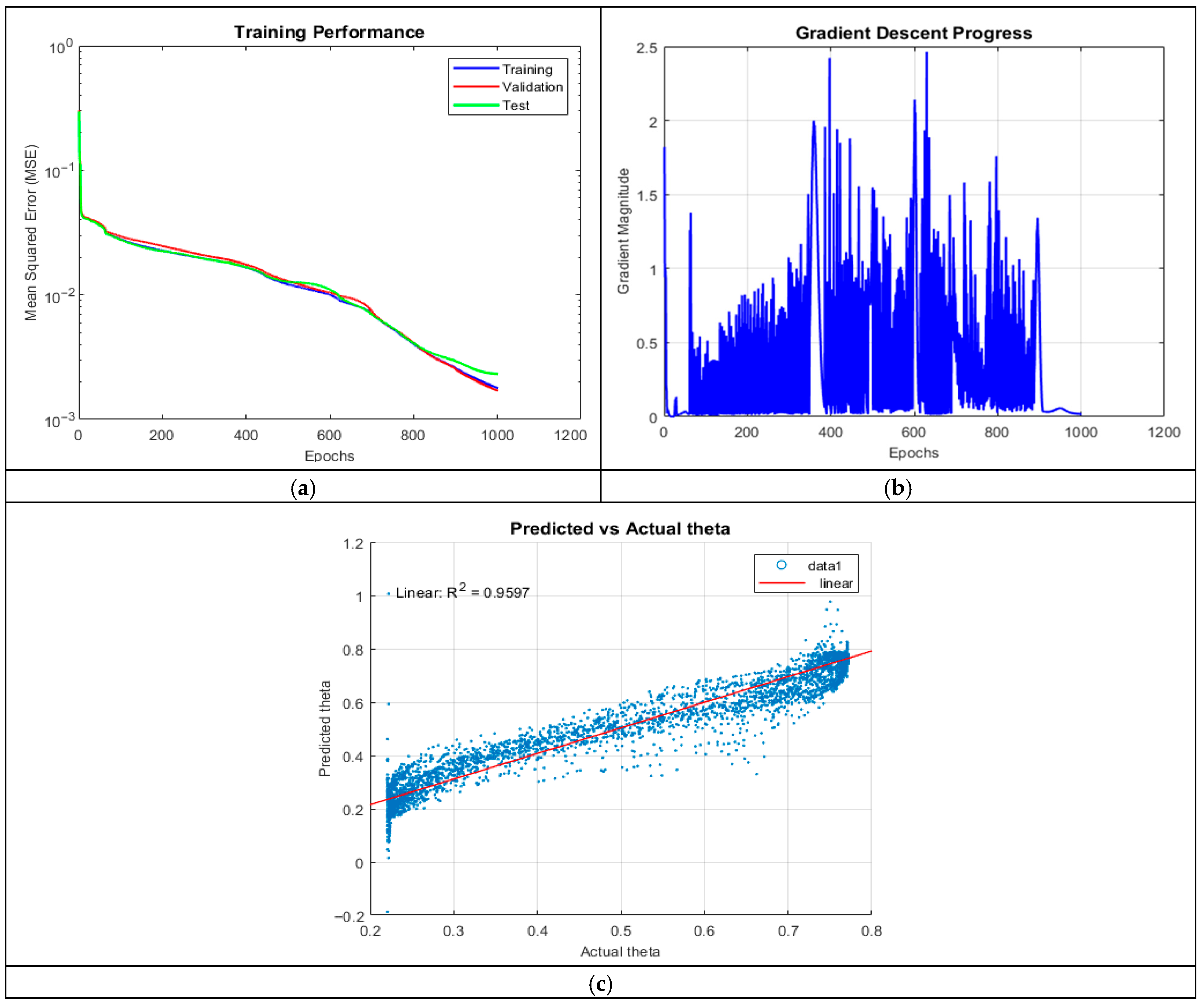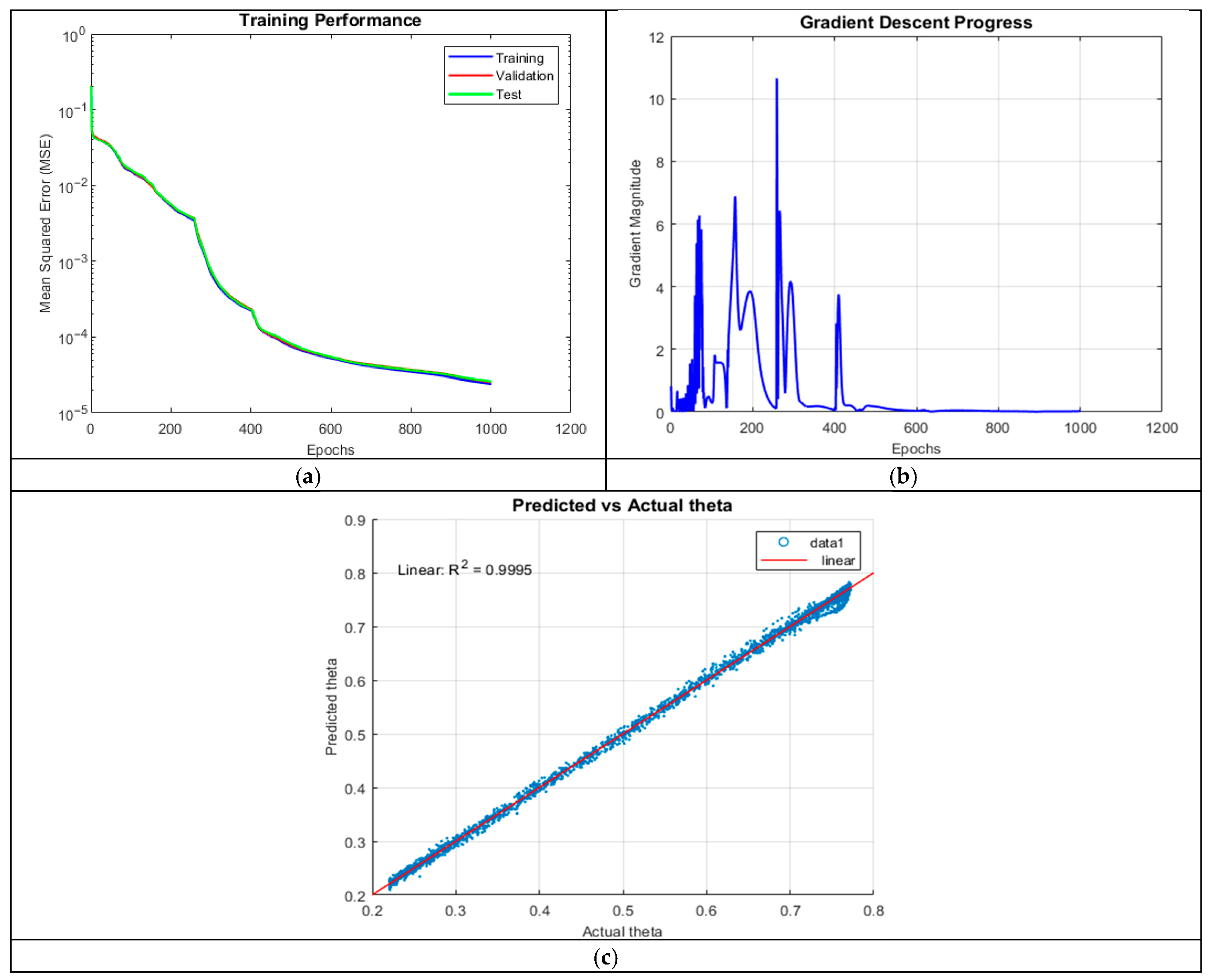 ANN_A5 (R2 = 0.9993) showed a slight decline compared to ANN_A4. The model reached the 1000-epoch limit, and a single outlier at lower theta values indicated sensitivity to extreme cases. The slight increase in MSE suggests mild overfitting due to excessive parameterization, which may have reduced generalizability.