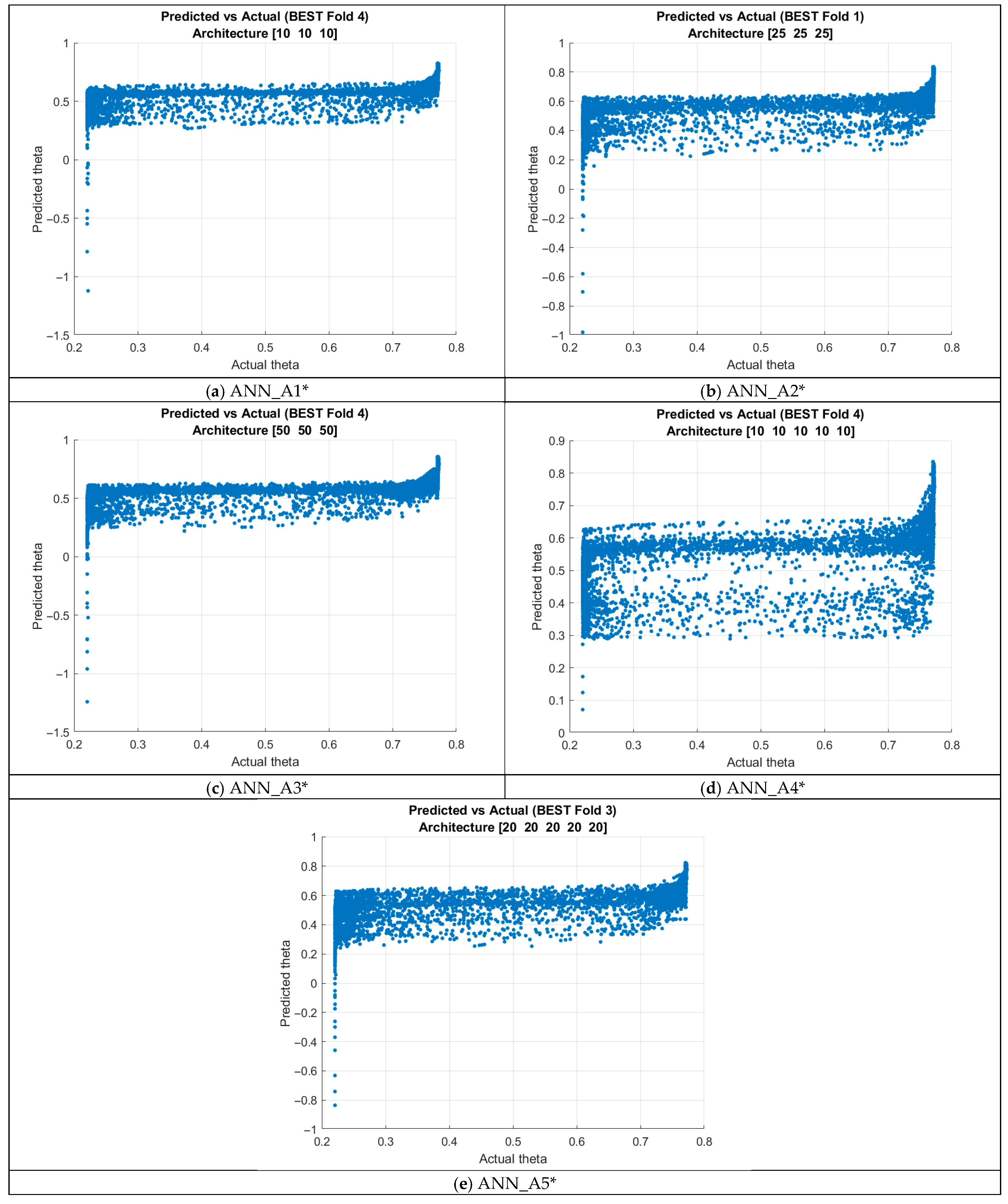 Additionally, increasing the number of neurons or hidden layers did not substantially improve performance under cross-validation. Although the 20-20-20-20-20 architecture exhibited the highest mean R2 (0.4077), the improvement was marginal and insufficient to compensate for the reduced training data per fold. This suggests that deeper architectures may be prone to underfitting in K-fold settings due to the higher number of parameters and reduced sample availability. Overall, the cross-validation experiments demonstrate that while the TrainLM networks achieved high accuracy, their generalization capability is limited. The K-fold SCG results emphasize the importance of cross-validated training and indicate that additional data or alternative regularization strategies may be required to develop more robust predictive models for θ.