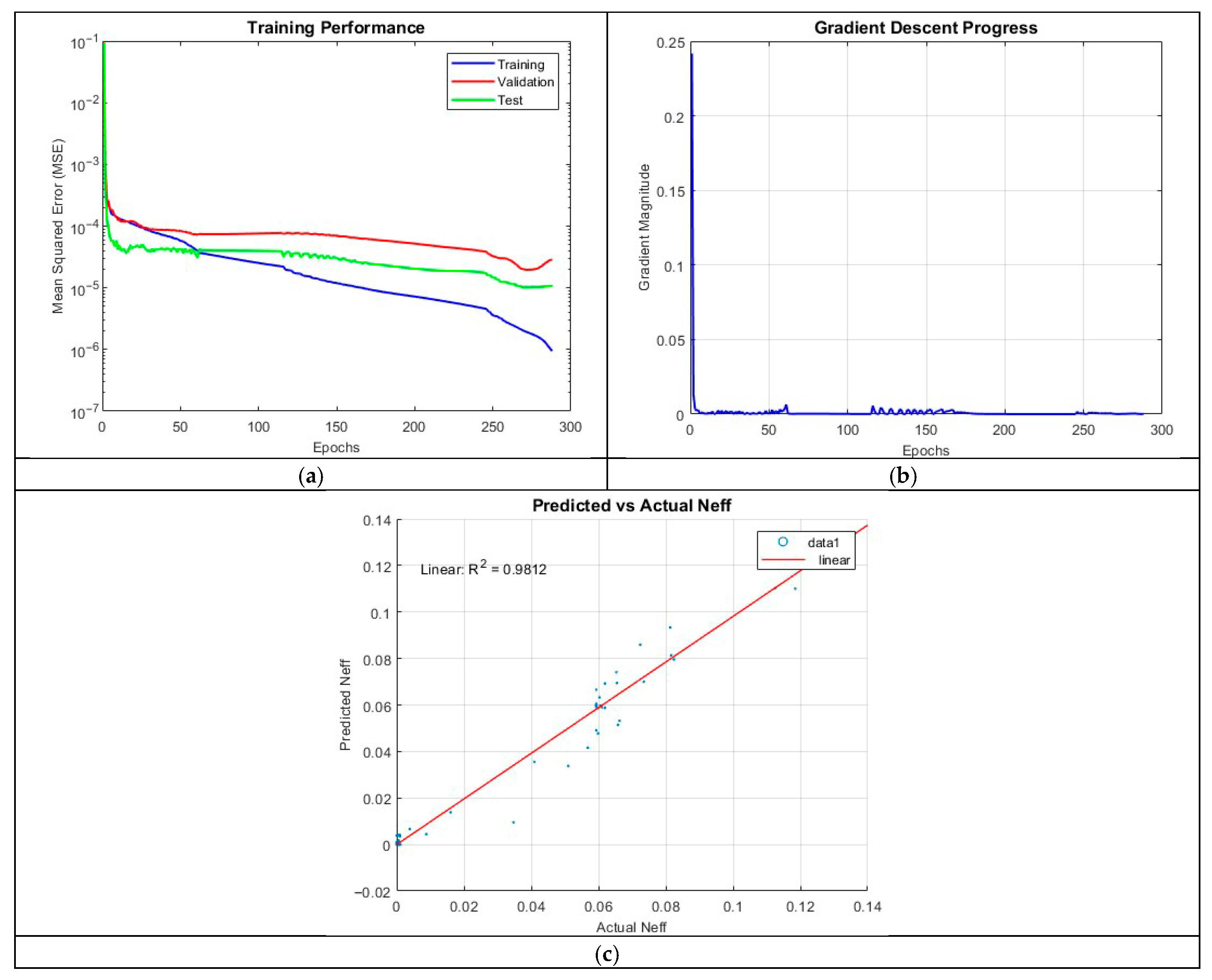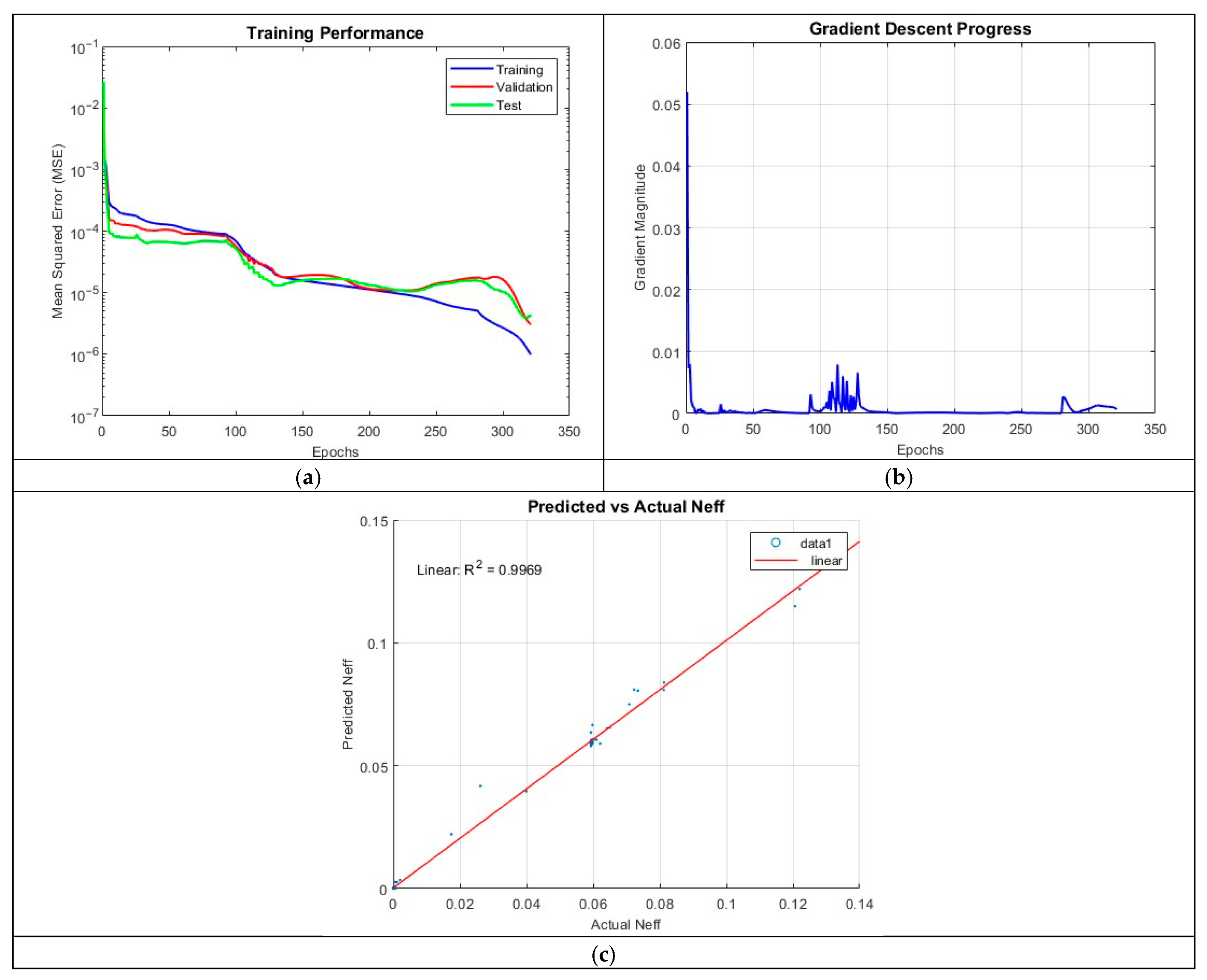 For K-fold cross-validation, the scaled conjugate gradient (TrainSCG) algorithm was used. This approach provided a more robust evaluation of model generalization by training and testing the network across multiple data splits, reducing the likelihood of overfitting due to lucky initializations. Model performance was evaluated using the coefficient of determination (R2) as the primary evaluator, ensuring alignment with the research objectives of accurately predicting both polar angles and refractive indices. Early stopping and monitoring of validation loss were applied consistently to prevent overfitting while maximizing predictive capability.