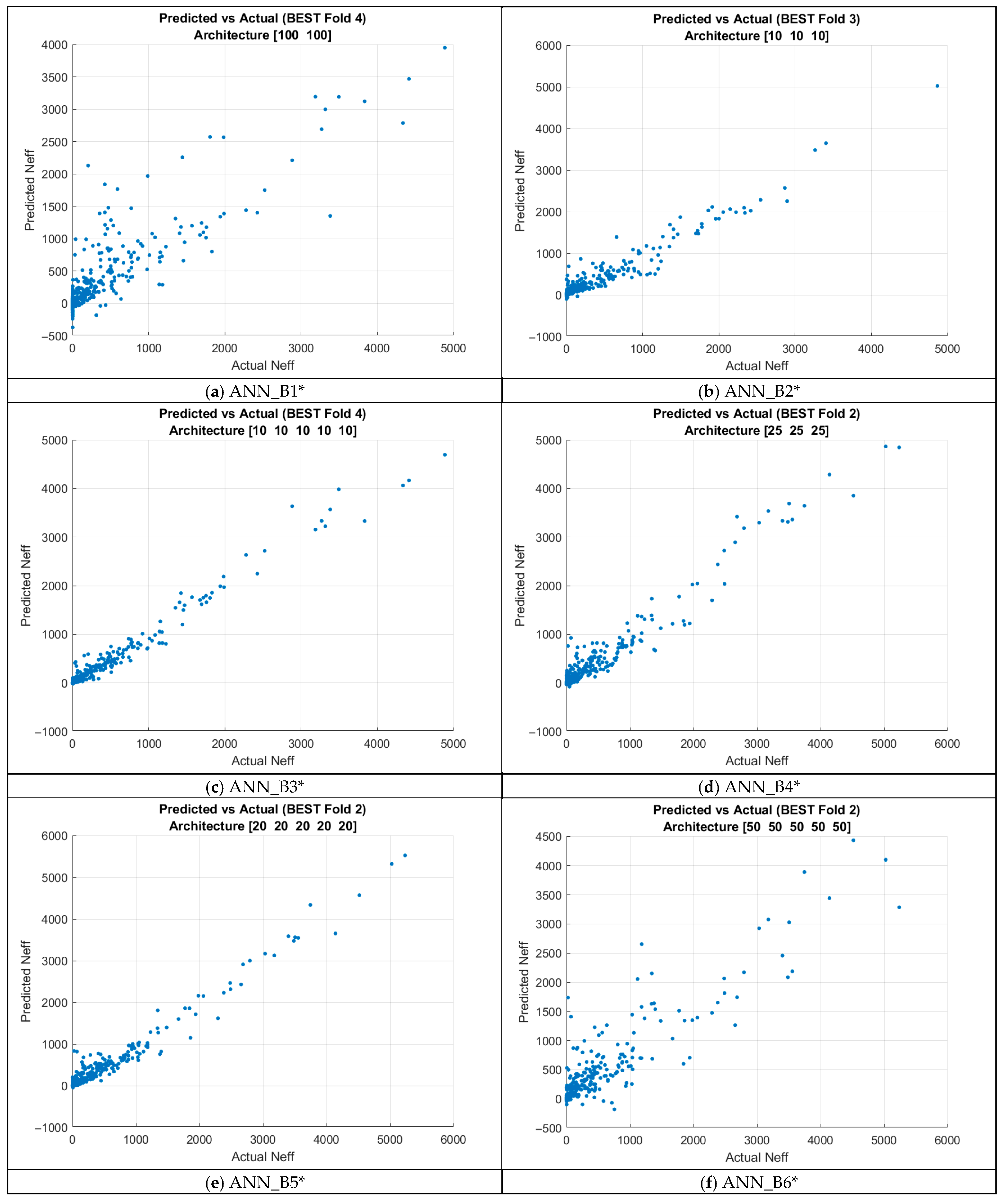 In the K-fold scenario for the refractive index, the training dataset was augmented from 624 to 13,000 points, and min–max normalization was applied to maintain physical bounds and prevent negative predictions. Negative values were eliminated through iterative resampling, ensuring that all predictions remained physically meaningful. With these modifications, K-fold performance improved considerably, achieving R2 values between 0.90 and 0.94. This demonstrates that sufficient data quantity and appropriate normalization can mitigate convergence challenges inherent to TrainSCG, allowing the network to generalize effectively even with cross-validation splits. Notably, the best-performing K-fold architecture, ANN_B4*, differed from the TrainLM optimal network, highlighting how cross-validation can shift the preferred network choice toward models that better generalize to unseen data.