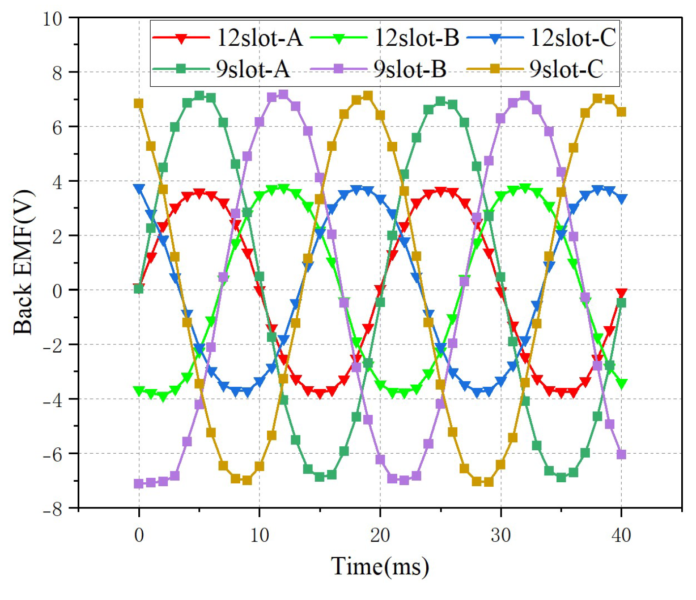 | Back-EMF (V) | 4 V | 7 V | The 12-slot structure has a higher back-EMF. |