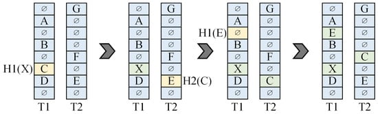 Cuckoo hashing is an effective method for achieving exact matching in certain applications. It provides good memory utilization and deterministic worst-case access time [16]. Refs. [16,18,29,30] improve the memory utilization of KVS systems by implementing cuckoo hash on FPGAs. Figure 1 shows that cuckoo hashing aims to solve the problem of low memory utilization caused by hash collisions through eviction strategies. However, this approach also has two negative effects.