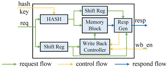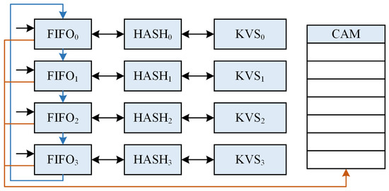 As shown in Figure 3, ref. [17] refers to [16], which employs a four-way parallel hash to construct a KVS. Ref. [17] can handle up to four requests per cycle, with each request accessing a distinct hash table. The response is generated only after a successful key match. If a request fails, it moves on to the next hash table. As a result, the subsequent hash table will be unable to accept external requests in the following cycle. This scheme guarantees minimum performance equal to the frequency of the system clock. However, a small number of parallel hash tables cannot guarantee a high storage load factor. If the parallel hash tables of this scheme are increased to improve the load factor, keeping the same size as [15], the system requires more tables. For instance, 128 hash tables are implemented to achieve a 95% load factor. In the worst case, this scheme will traverse these 128 hash tables serially, and 128-deep response reordering needs to be performed. The overall latency would be about 1 to 2 s, while a layer 3 switch would have a latency of about 2 s for forwarding 64B packets. This results in almost double the latency metrics of the network device.