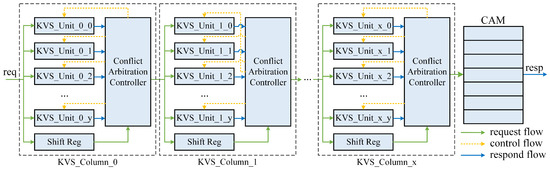 The KVS matrix comprises at least one KVS Column and a CAM. The number of KVS Columns can be passed in by the top-level parameter. Each KVS Column has the same function. The CAM is located behind the last KVS Column in the KVS matrix. The CAM is responsible for storing the requests that cannot be processed by all the previous KVS Columns. It is inspired by [14] for improving the KVS system’s robustness.