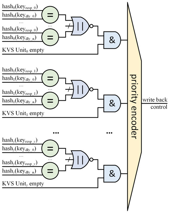 So, we use shift registers to save the insert request addresses (hash(keydly)) during the write-back latency. Each insertion address is compared one by one to determine if there are any conflicts with previously arrived requests. Only if the address of the insert request is available (empty) and (AND gate in Figure 6) does not conflict with any of the insert request addresses during the write-back latency (NOR gate in Figure 6) is it considered to be a KVS Unit that can respond to that insert request. Although the judgment condition may appear strict, our implementation utilizes 128 KVS Units, each with its own independent hash function. This provides 128 opportunities to solve collisions for insert requests while still maintaining a high overall load factor.