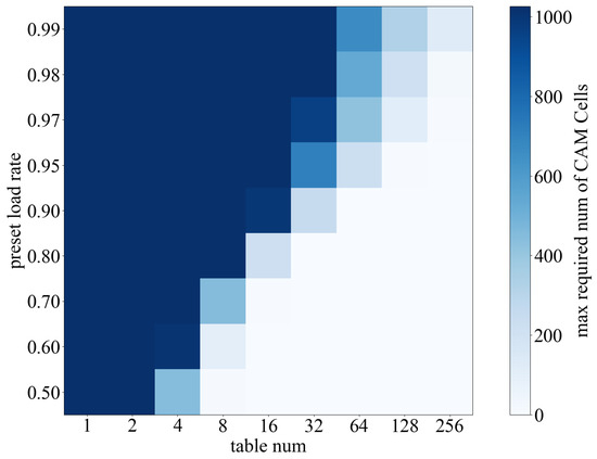 Here, N represents the number of requests that are about to enter the KVS matrix. The depth of the hash table in a commercial switch is typically around 64 K [39]. Our recommended number of re-hashing times is 128. Thus, insert requests moving to the CAM are extremely rare even when the load factor is at 95%. At this specification, the required CAM capacity is approximately 65 entries (). This level of CAM depth is relatively easy to implement in FPGAs.
