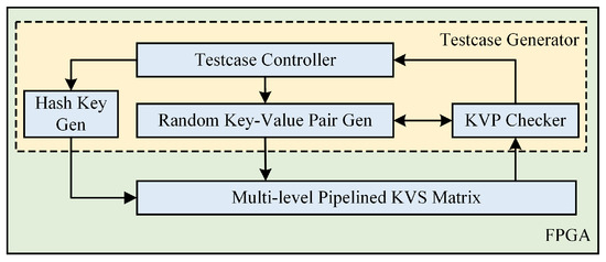 In order to assess the proposed multi-level pipelined KVS architecture, we have devised a platform as depicted in Figure 10. The hash key generator module is utilized to inject random hash keys into all hash tables. The random key–value pair generator module is capable of generating pseudo-random data to simulate real-world KVP traffic. The KVP checker module compares the output response results of our architecture with the expected response, thus recording any erroneous outcomes. The testcase controller computes latency and throughput, counts error entries, and transmits the results out of the module for viewing through a register interface or the Vivado ILA tool.