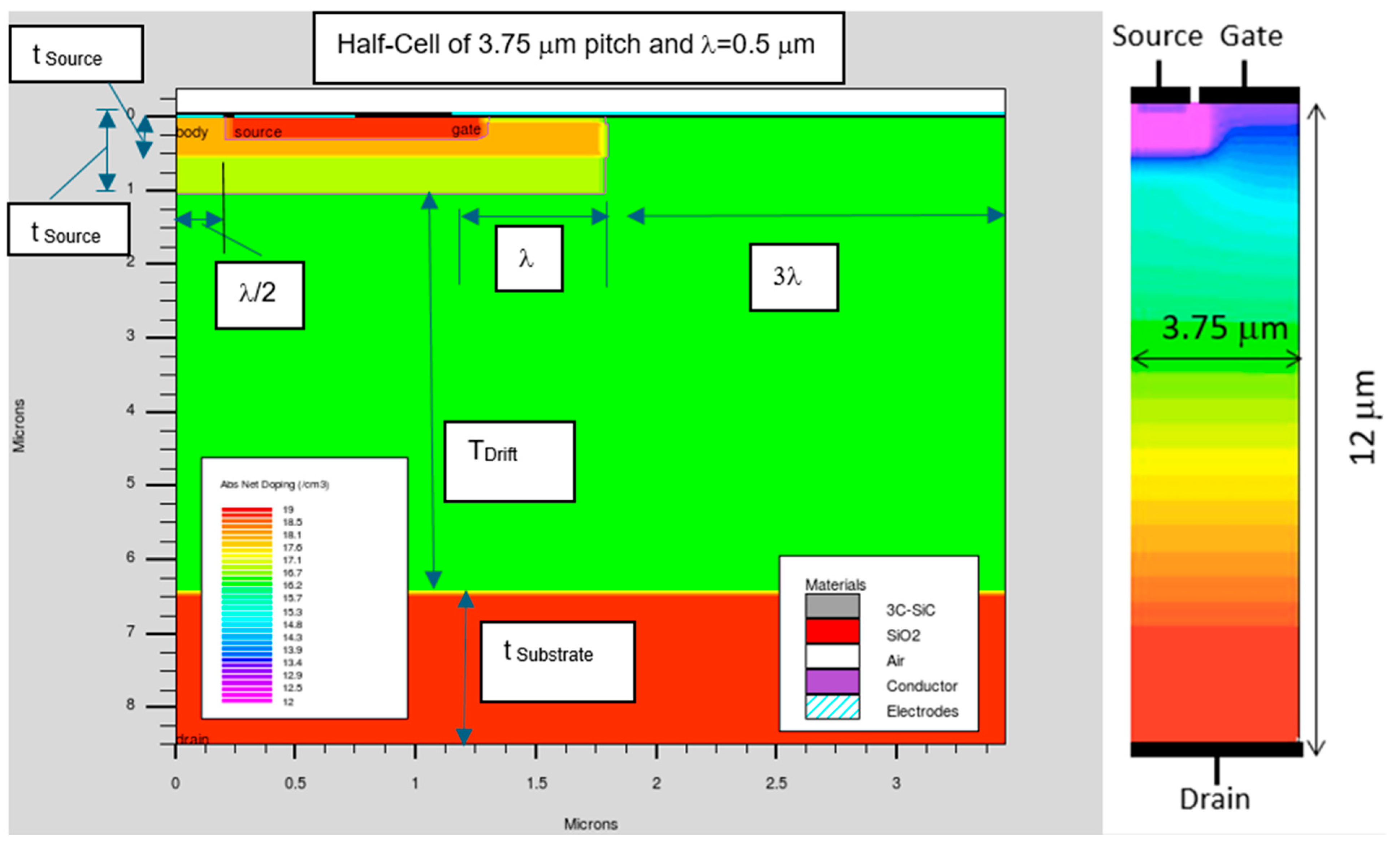 - Van Zeghbroeck, B.; Fardi, H. Comparison of 3C-SiC and 4H-SiC power MOSFETs. Mater. Sci. Forum 2018, 924, 774–777. [Google Scholar] [CrossRef]
