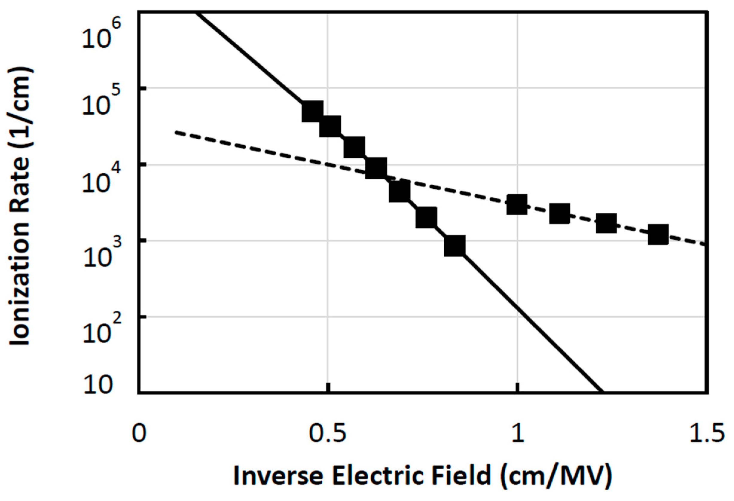 - Tirino, L.; Weber, M.; Brennan, K.F. Temperature dependence of the impact ionization coefficients in GaAs, cubic SiC, and zinc-blende GaN. J. Appl. Phys. 2003, 94, 423. [Google Scholar] [CrossRef]