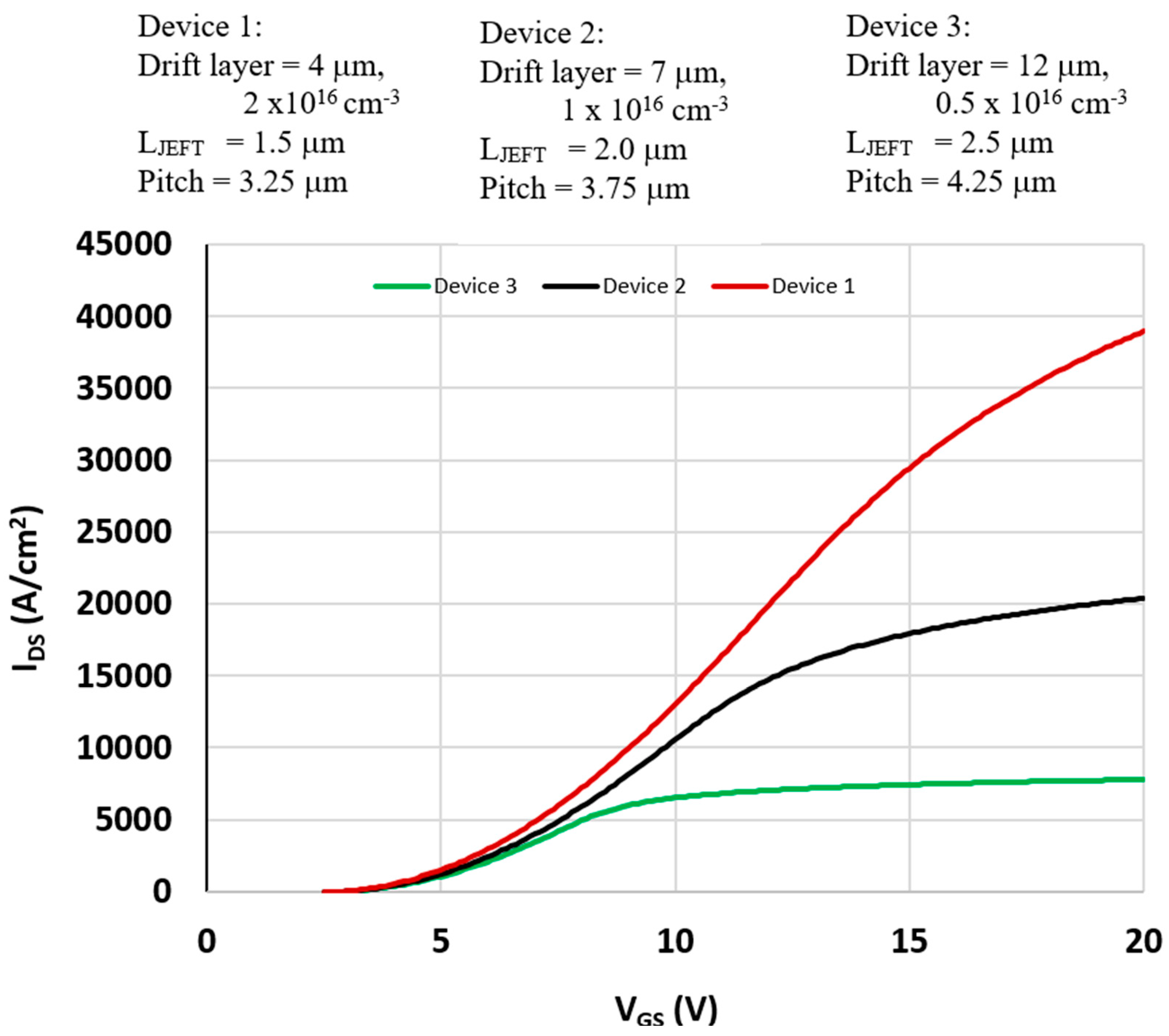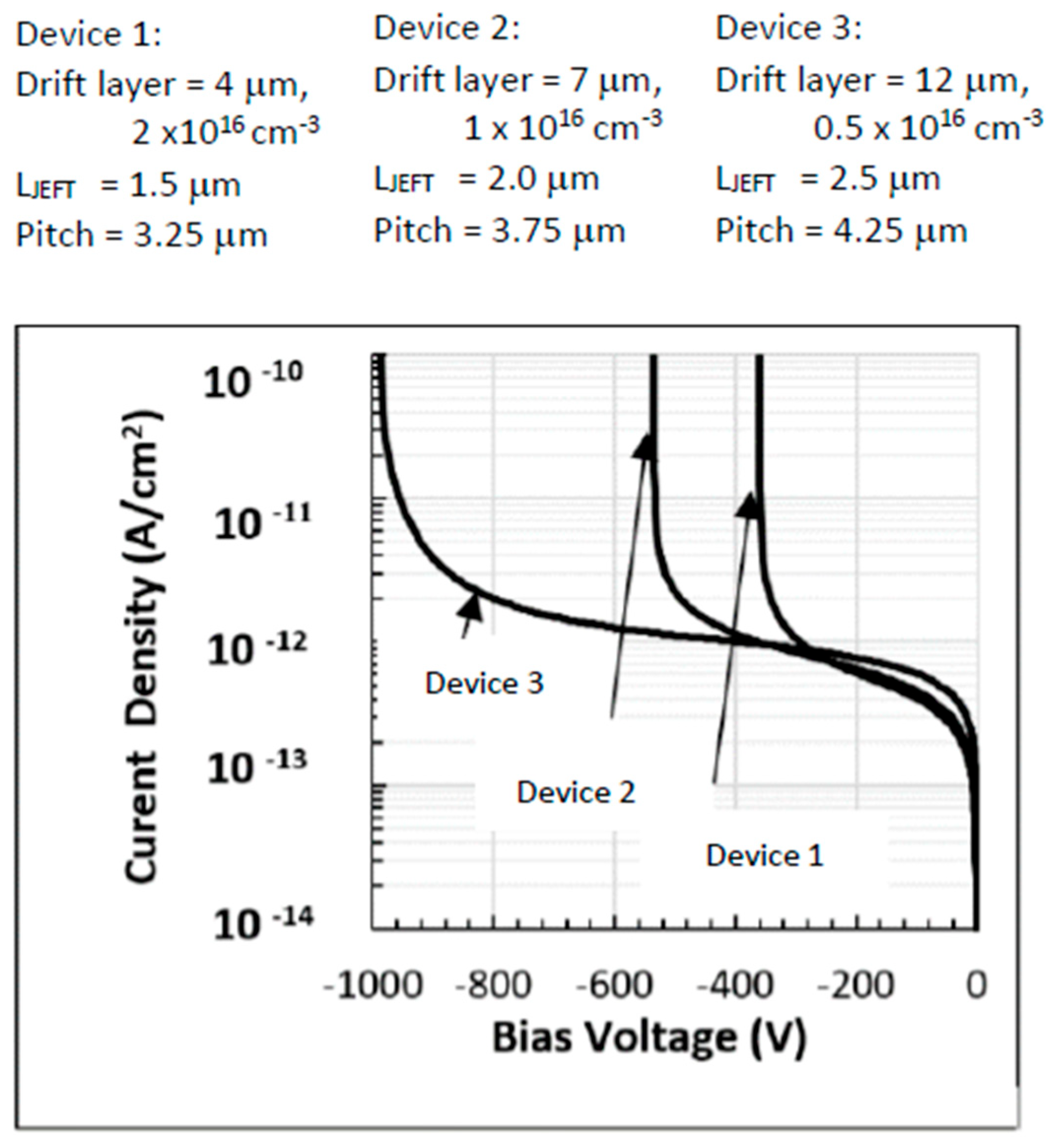 | Drift Layer doping (cm−3) | 2 × 1016 | 1 × 1016 | 0.5 × 1016 |