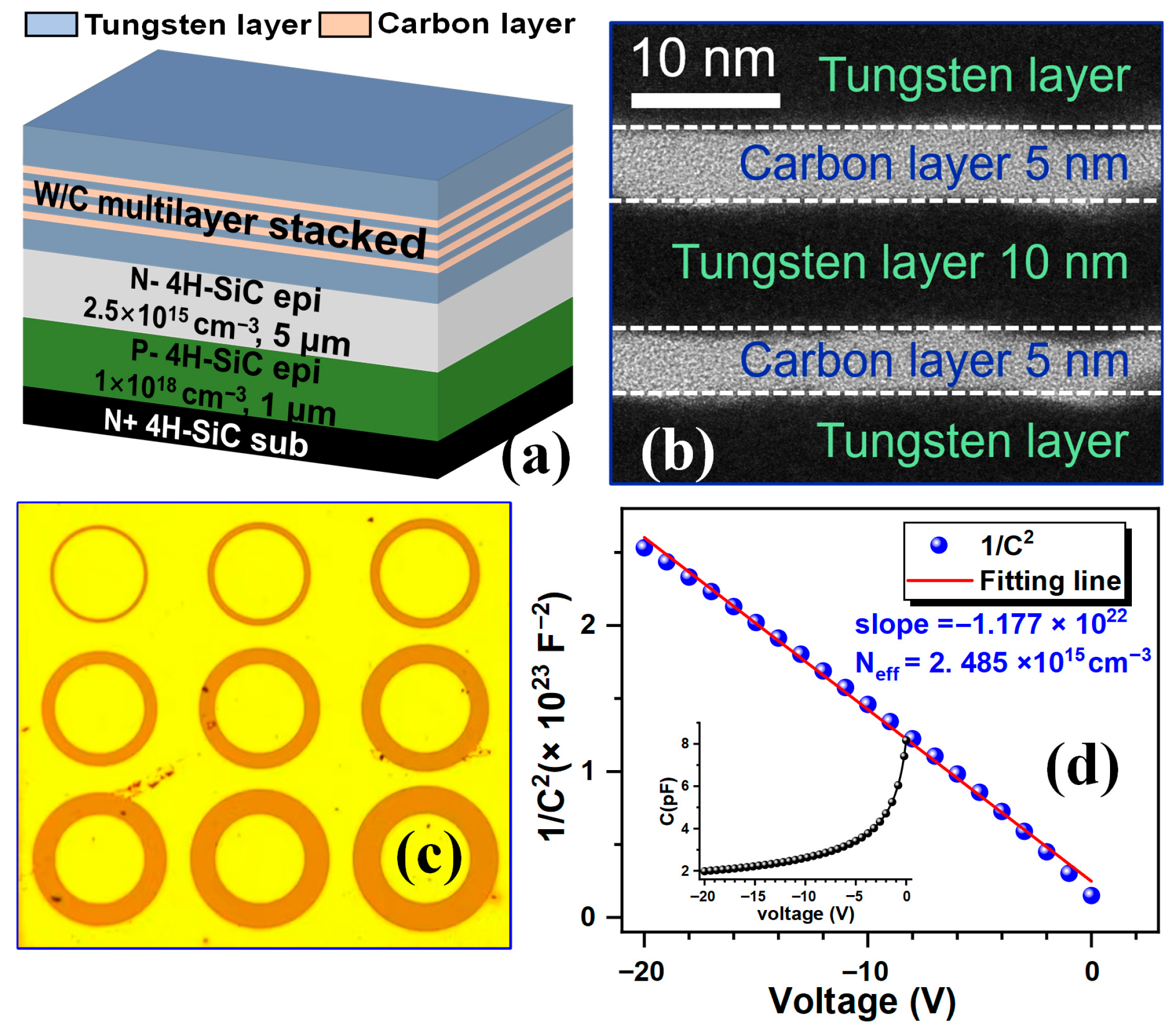 Zhou Y, Du F, Song Q, Tang X, Yuan H, Han C, Zhang C, Zhang Y. A High-Temperature Stable Ohmic Contact Process on Lightly Doped n-Type 4H-SiC Based on a W/C Multilayer Structure. Micromachines. 2025; 16(12):1408. https://doi.org/10.3390/mi16121408