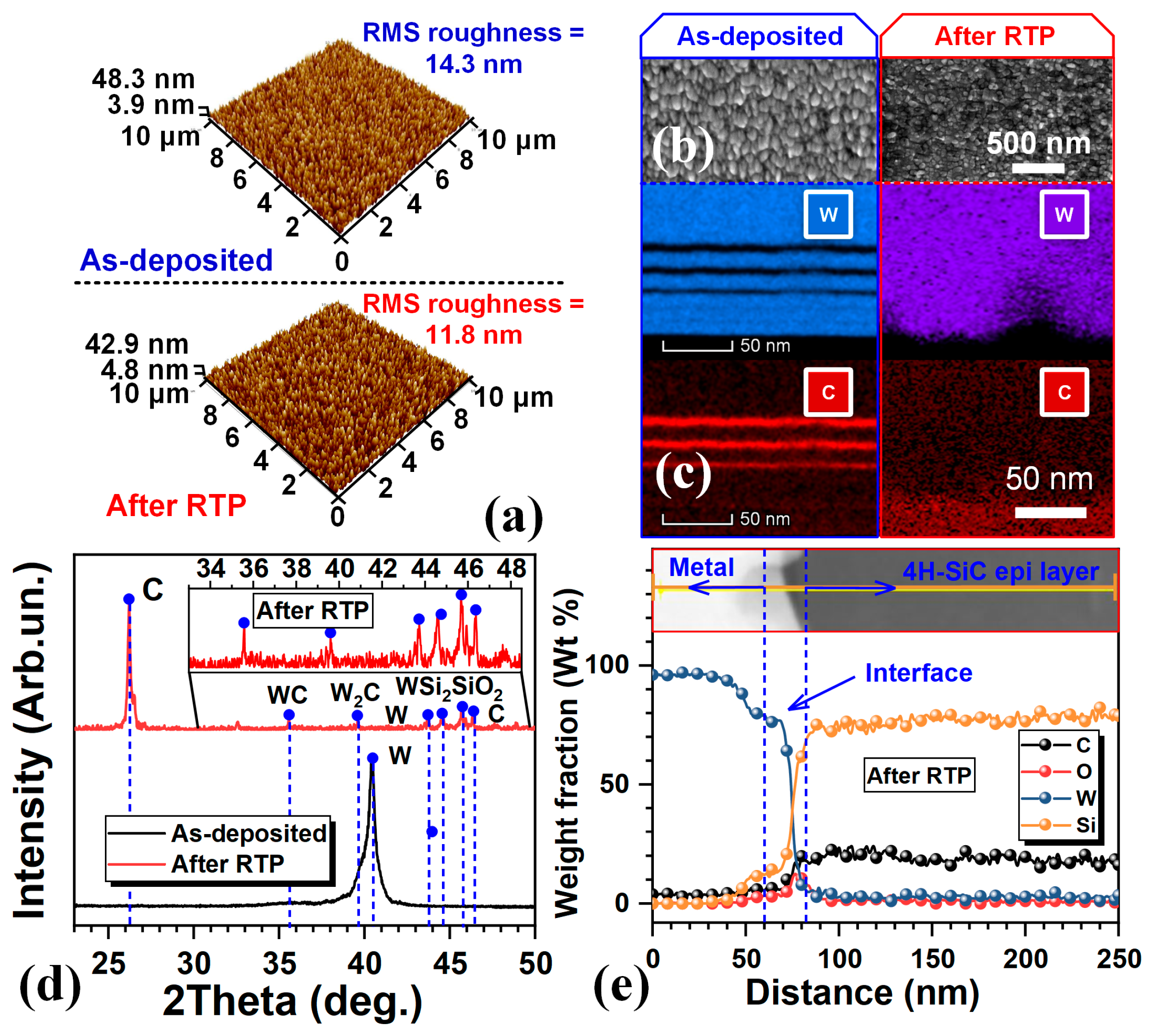 - Rogowski, J.; Kubiak, A. Effects of annealing temperature on the structure and electrical properties of tungsten contacts to n-type silicon carbide. Mater. Sci. Eng. B 2015, 191, 57–65. [Google Scholar] [CrossRef]