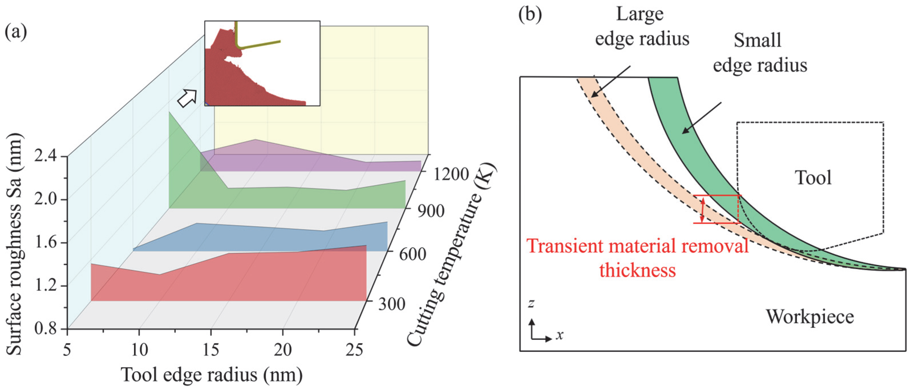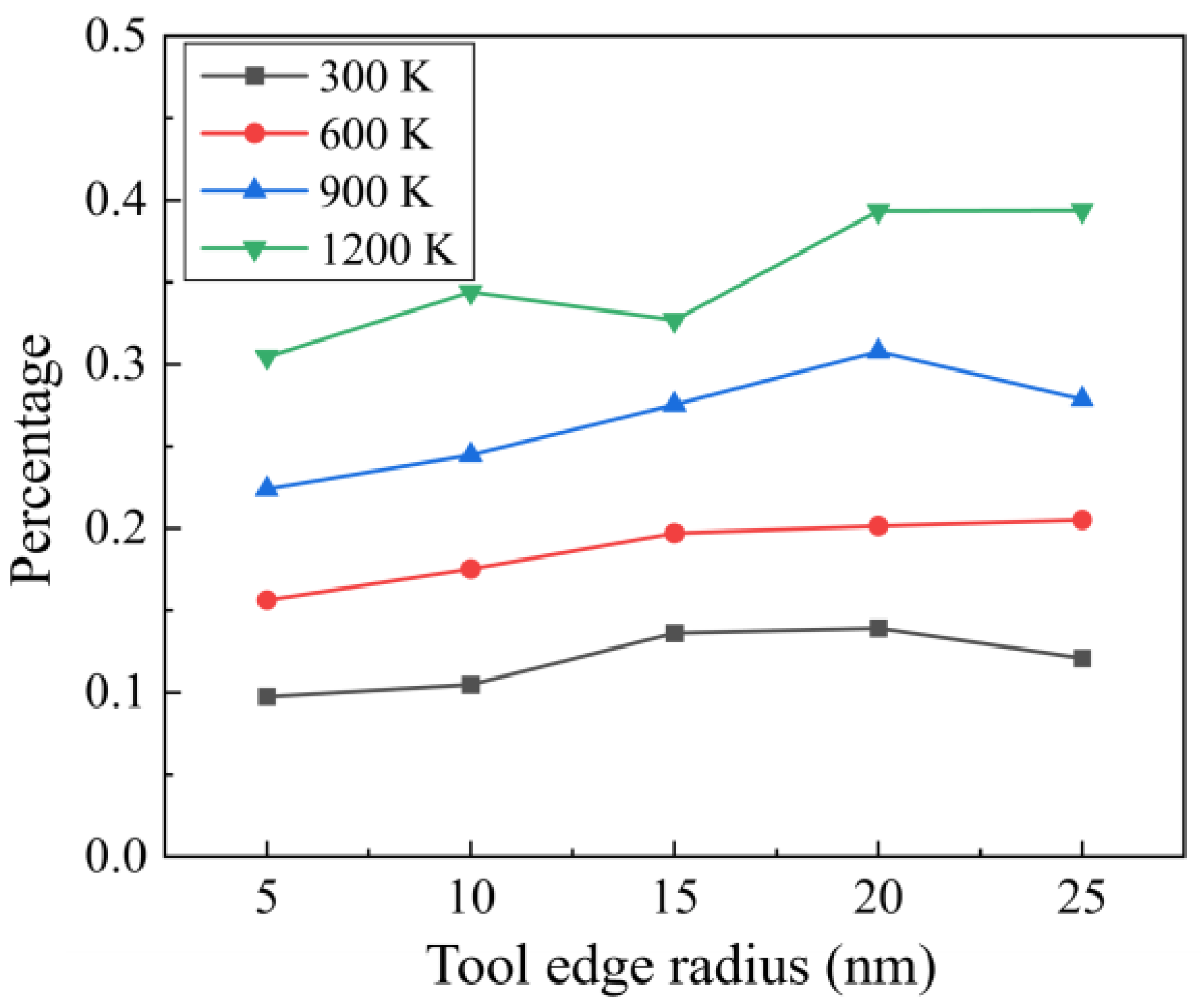 - With increasing tool edge radius, more disordered atoms are generated on the machined surface since the surface abrasion and extrusion stage is prolonged. As the temperature increases, the amorphous layer becomes inapparent, and more grains are left on the machined surface, which can be attributed to the enhanced dislocation-induced plastic deformation. Furthermore, recrystallization is promoted by raising the cutting temperature and tool edge radius.
