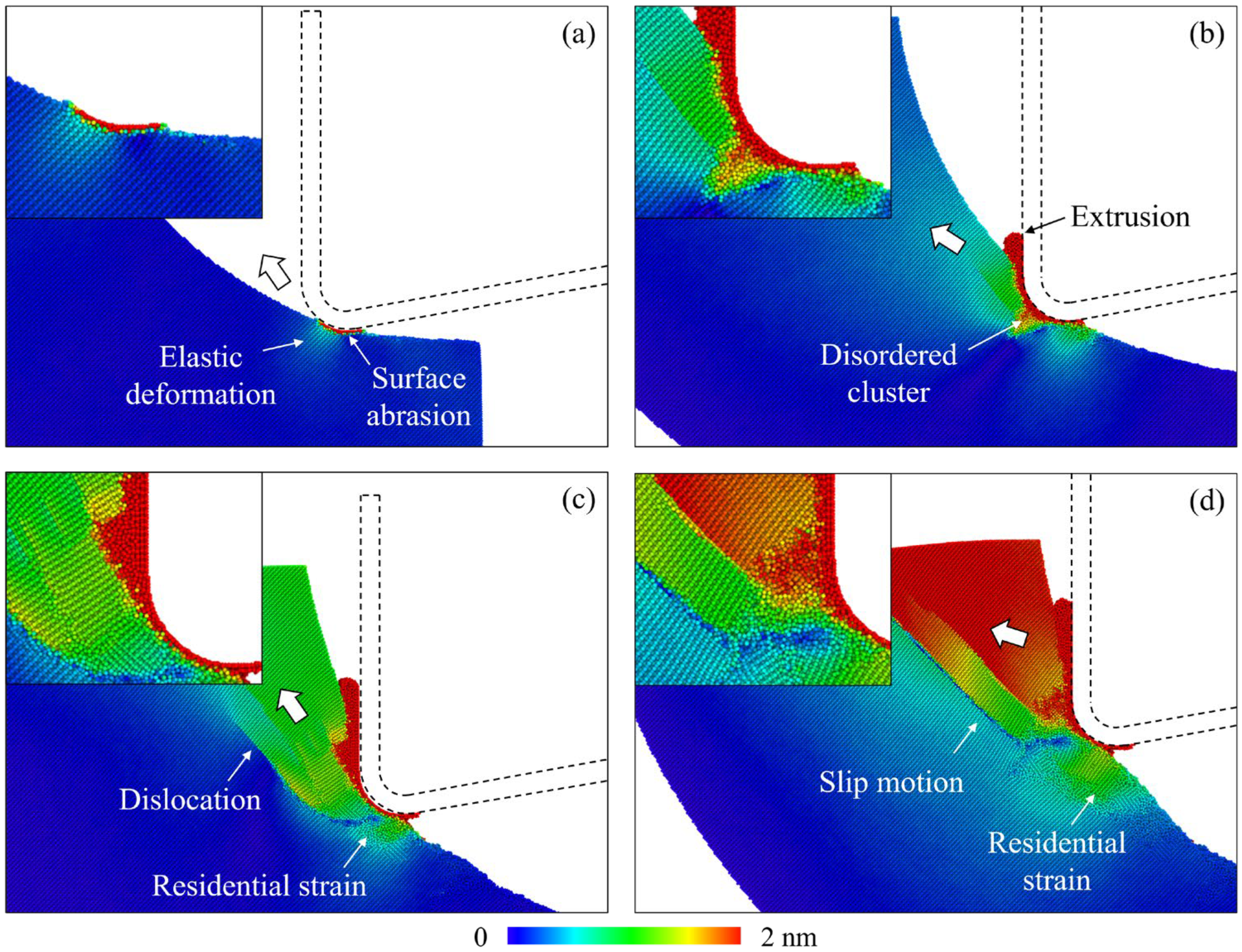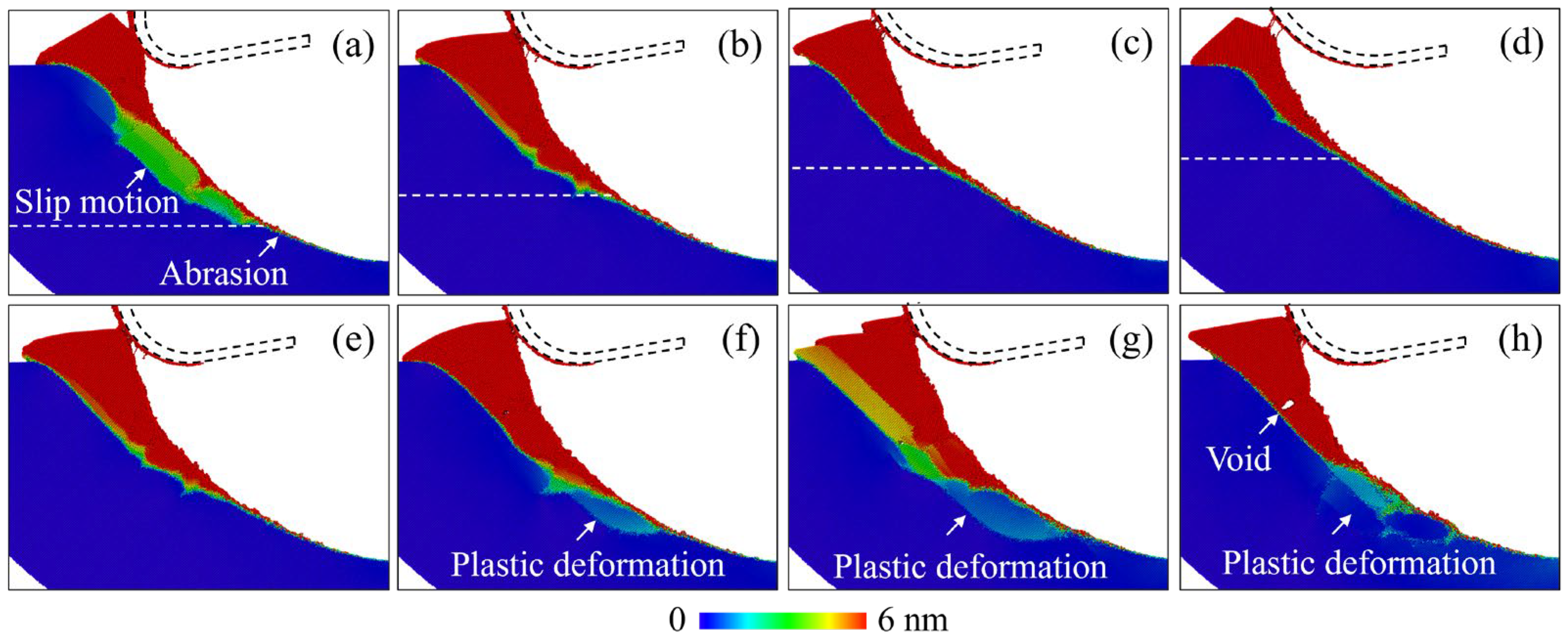 - As the tool edge radius increases, more surface abrasion and extrusion removal can be observed during the cutting stage. As the cutting temperature increases, the plastic deformation in the subsurface workpiece is promoted. In the surface abrasion and extrusion stage, obvious plastic deformation patterns are observed. During the shear stage, more slip bands are observed with voids formed in the subsurface workpiece.
