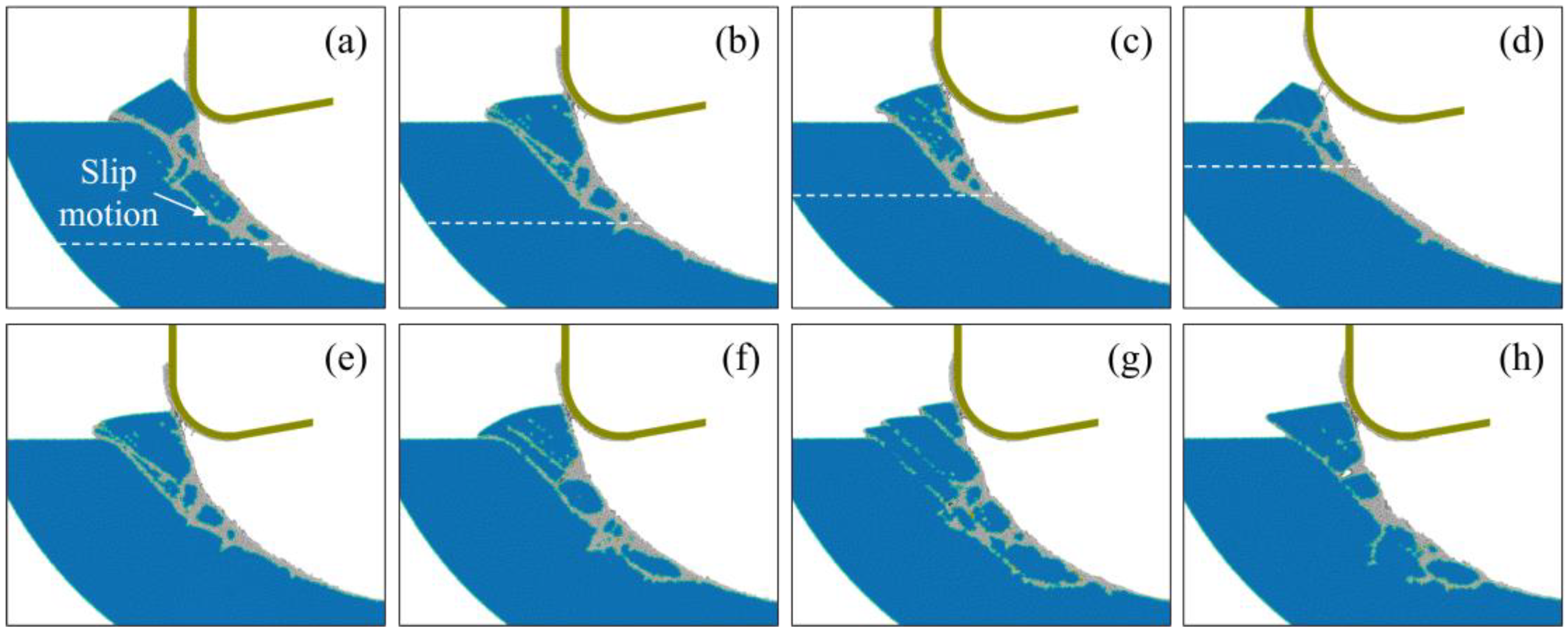 - Liu, C.; He, W.; Chu, J.; Zhang, J.; Chen, X.; Xiao, J.; Xu, J. Molecular Dynamics Simulation on Cutting Mechanism in the Hybrid Machining Process of Single-Crystal Silicon. Nanoscale Res. Lett. 2021, 16, 66. [Google Scholar] [CrossRef]