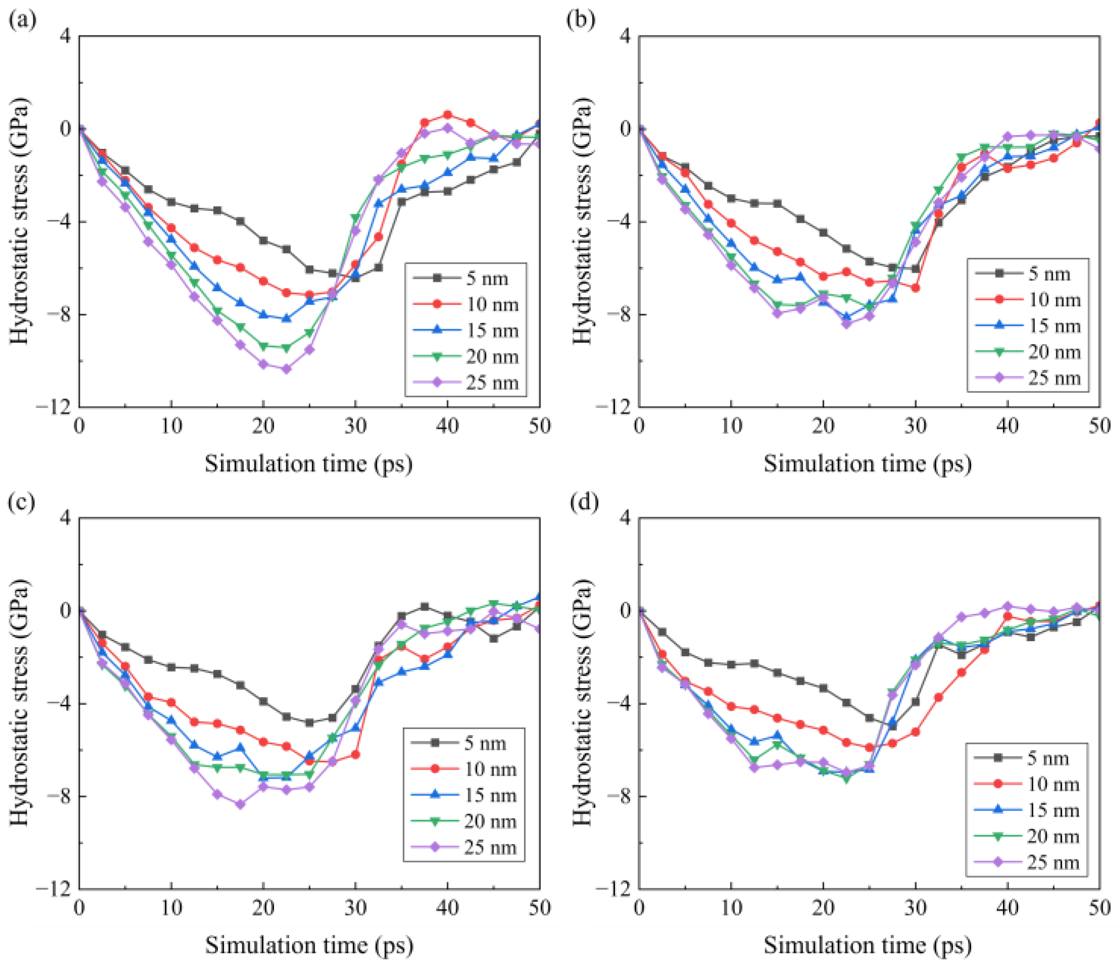 - As the cutting temperature increases, both hydrostatic stress and von Mises stress show an apparent decrease owing to the thermal softening of the workpiece material. For workpieces machined by a blunt tool, an increase in internal stress is observed, and the internal stress reaches a maximum earlier. While this phenomenon becomes less apparent when the cutting temperature increases, since the enhanced plastic deformability facilitates the detachment of the crystal grains.