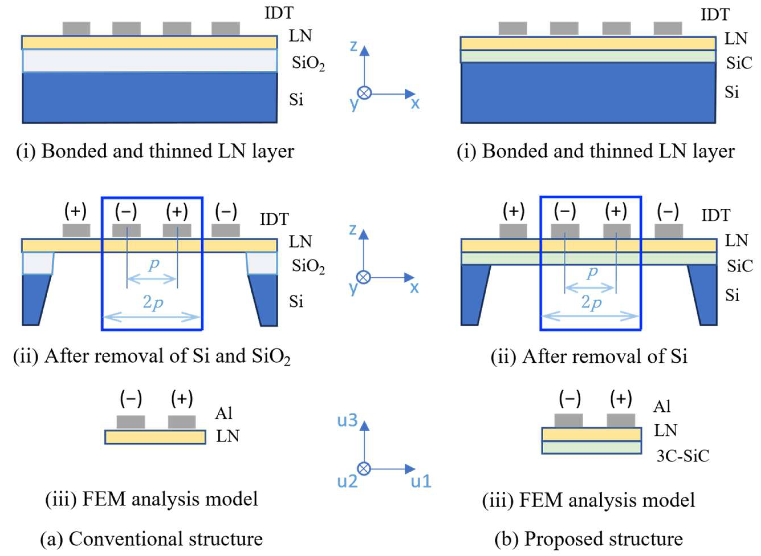 - With the experimental layer configuration, a phase velocity Vp exceeding 14,000 m/s was obtained. The A1 mode in the LN/SiC membrane structure enables frequency tuning through the IDT pitch; for example, resonance frequencies of 1.76 GHz and 1.18 GHz were obtained for pitches of 2p = 8.0 µm and 2p = 12.0 µm, respectively.