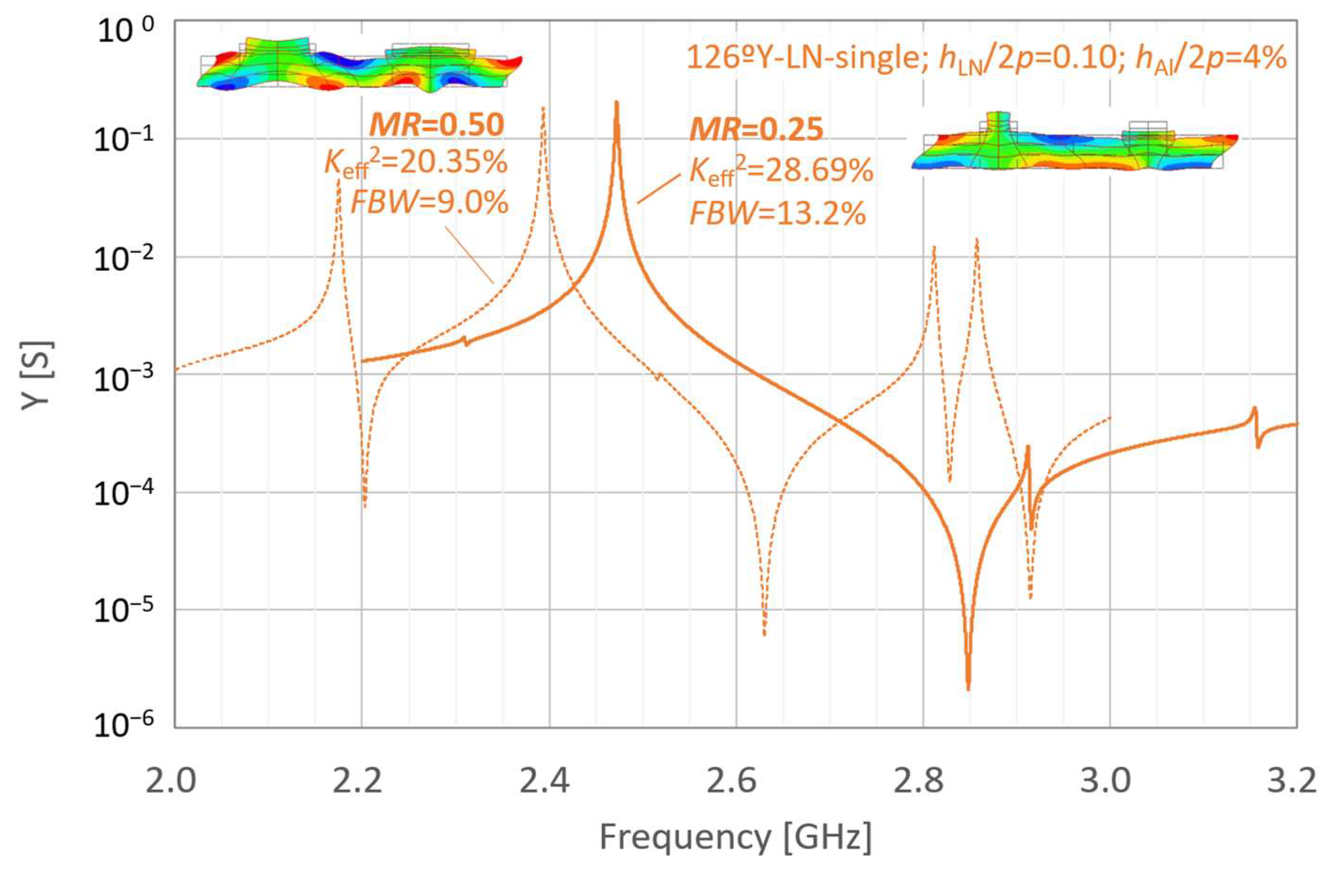 - Wu, Z.; Shi, B.; Li, Y.; Bailie, W.T.; Wong, Y.; Bao, J.; Hashimoto, K. Use of heavy dielectric materials in solidly mounted A1 mode resonators based on lithium niobate. Jpn. J. Appl. Phys. 2022, 61, SG1001. [Google Scholar] [CrossRef]
