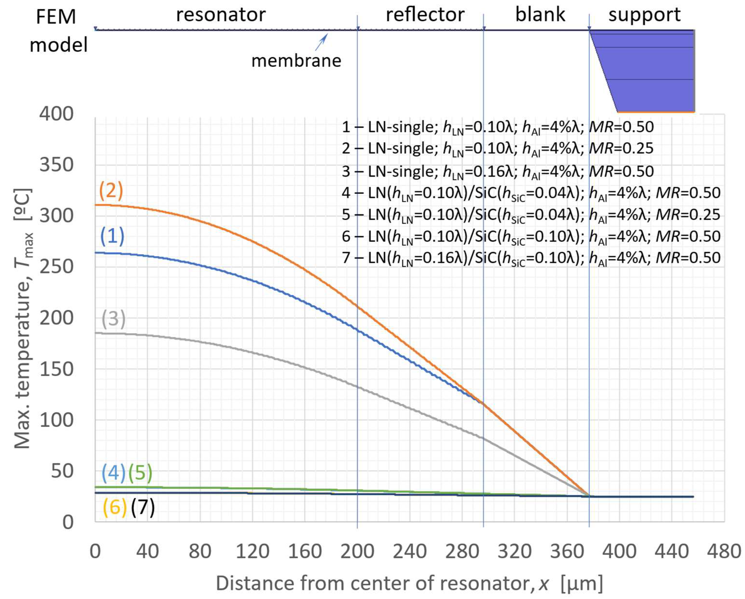 - Thermal conduction analysis demonstrated the effectiveness of the high thermal conductivity of SiC in the LN/SiC thin-membrane structure, significantly suppressing temperature rise within the resonator. Notably, even in the very thin-membrane configuration, the peak temperature increase remained as low as only 30–40 °C, in stark contrast to the nearly 300 °C rise observed in the LN-single structure, highlighting its promising potential for high-power durability.