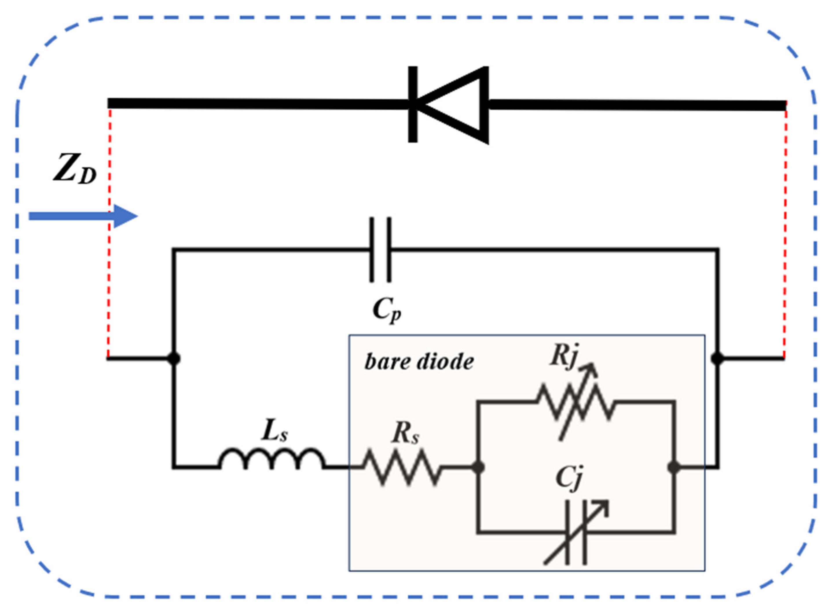 j are expressed in Equations (2) and (3), respectively. These expressions constitute the basis for calculating the diode impedance and enable a more accurate analysis of the diode’s behavior under varying signal conditions.