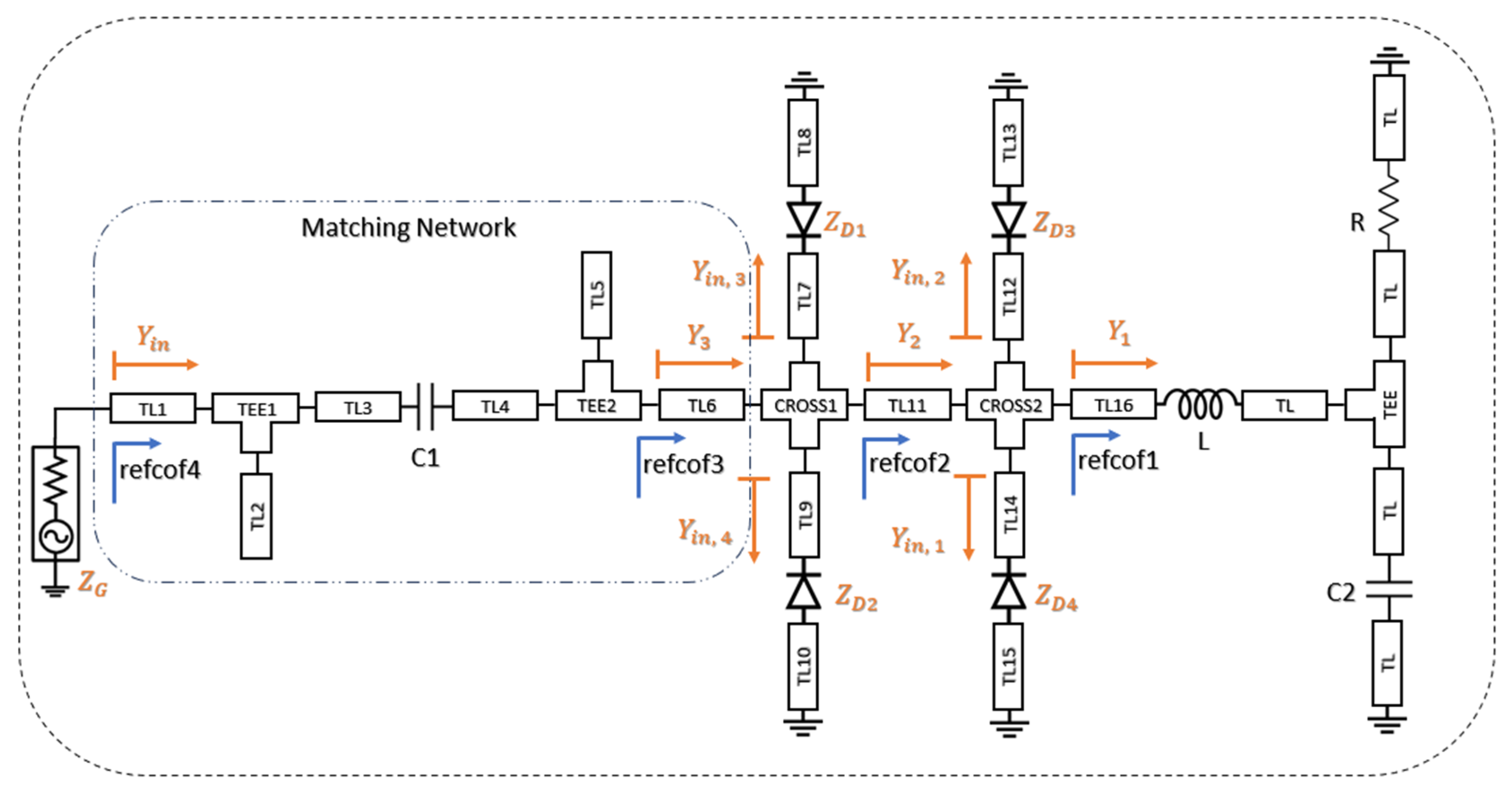 In this study, four Schottky diodes were employed; therefore, the impedance characteristics of the diodes were initially analyzed as part of the design procedure.