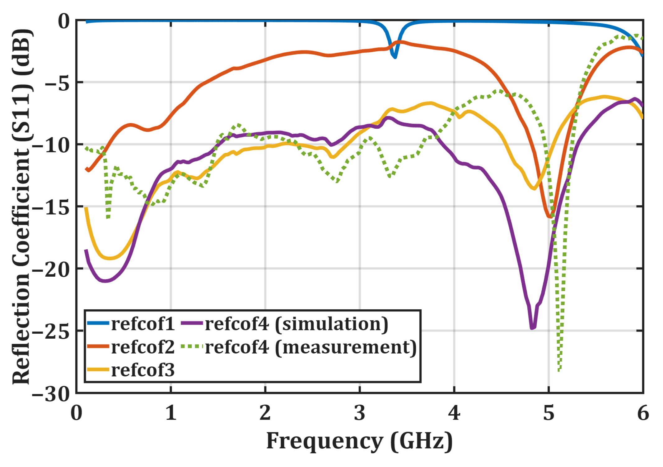 11 in the simulation environment during the design process. Here, the refcof1 configuration represents the condition without the parallel branches and without the matching network. In this case, the RF choke used to prevent the high-frequency RF signal from propagating toward the DC output is selected with a large inductance value, resulting in a very high impedance at high frequencies. This behavior is observed in