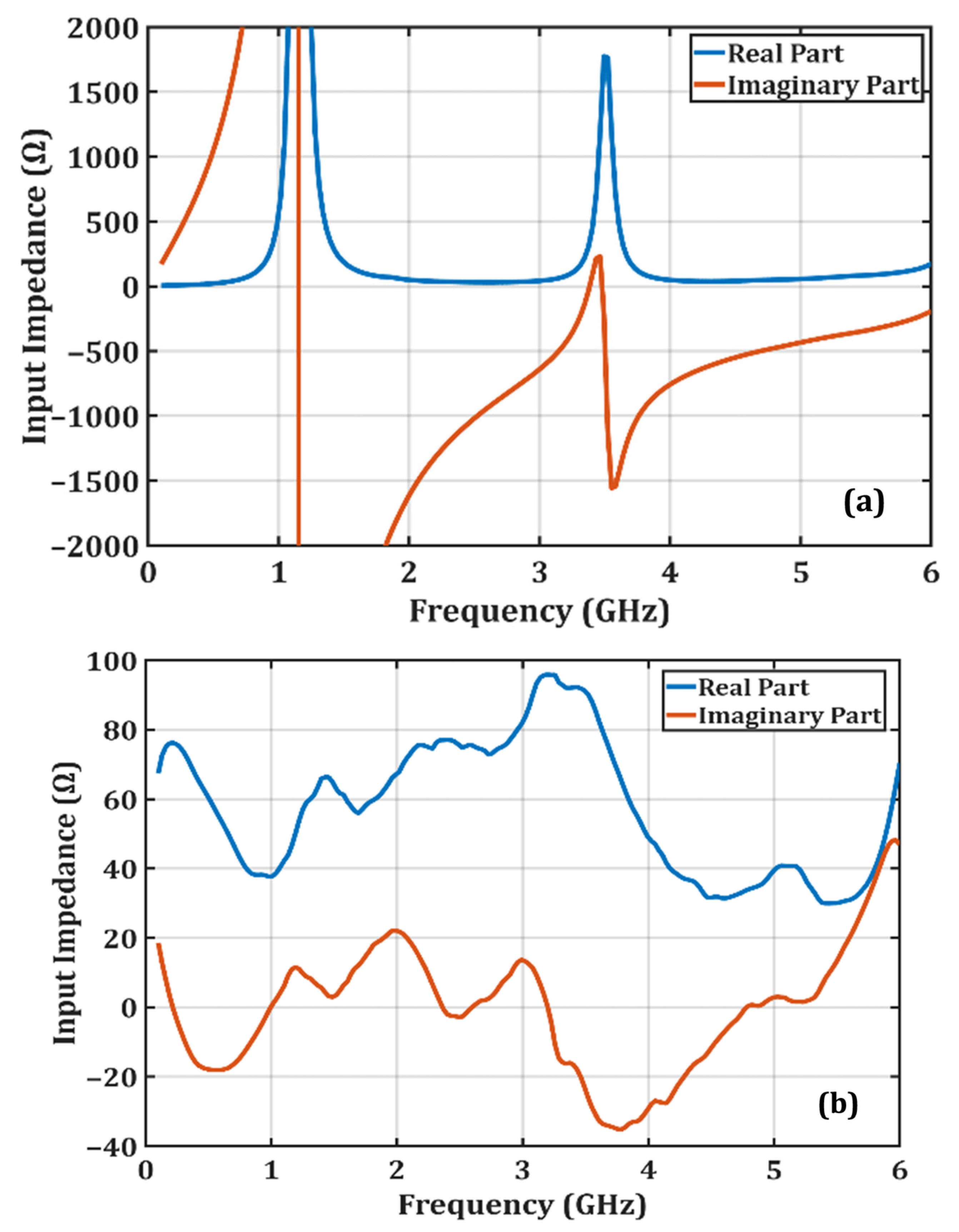 Figure 4a, which shows the input impedance before impedance matching; in this graph, the reactive component of the input impedance takes excessively large values. Consequently, the admittance Y