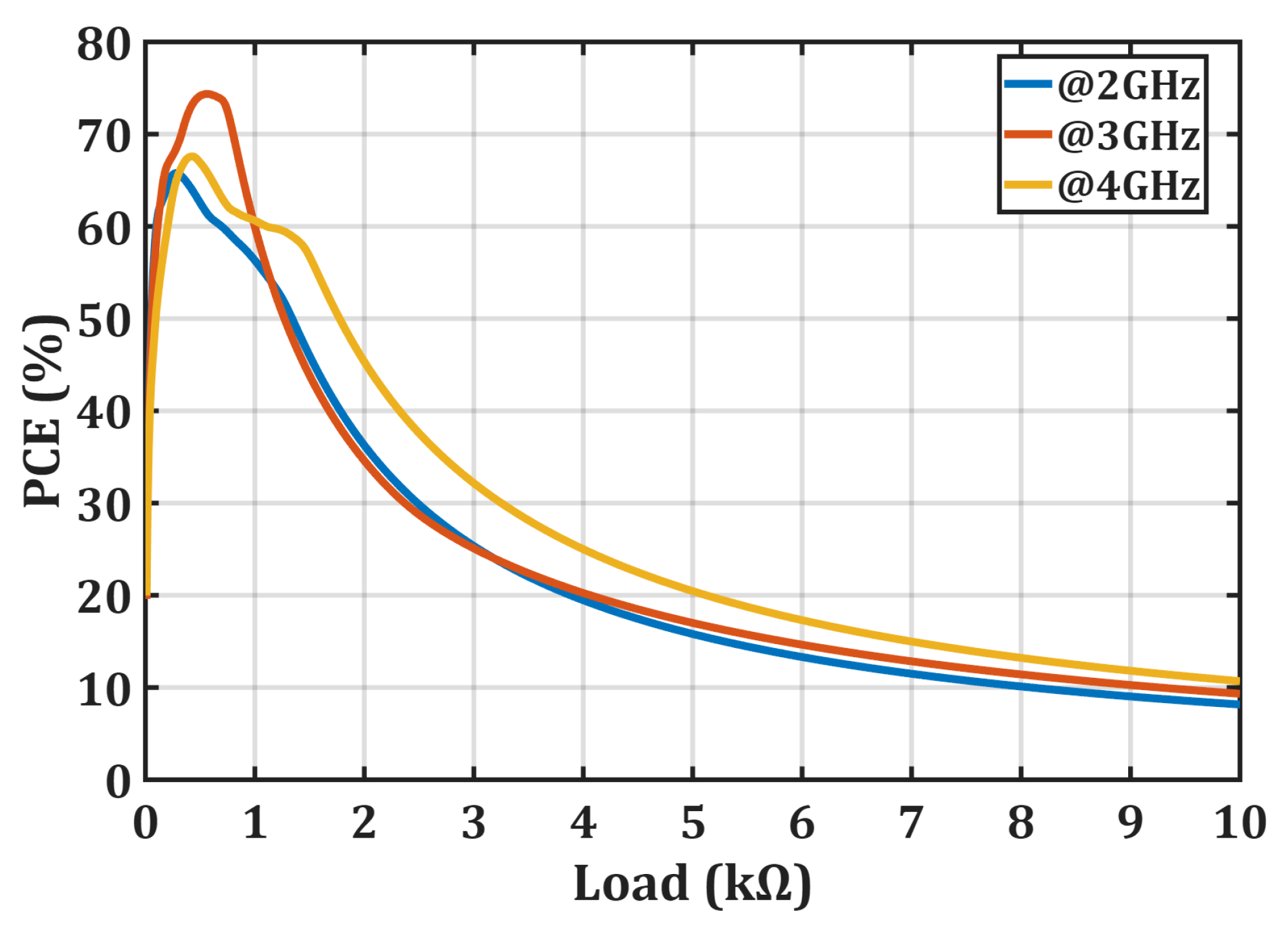 Figure 7 shows the variation in PCE depending on the load resistance at different operating frequencies. The simulation results indicate that the rectifier maintains an efficiency of 50% or higher for load resistance values ranging from 60 Ω to 1.26 kΩ at operating frequencies of 2 GHz, 3 GHz, and 4 GHz.