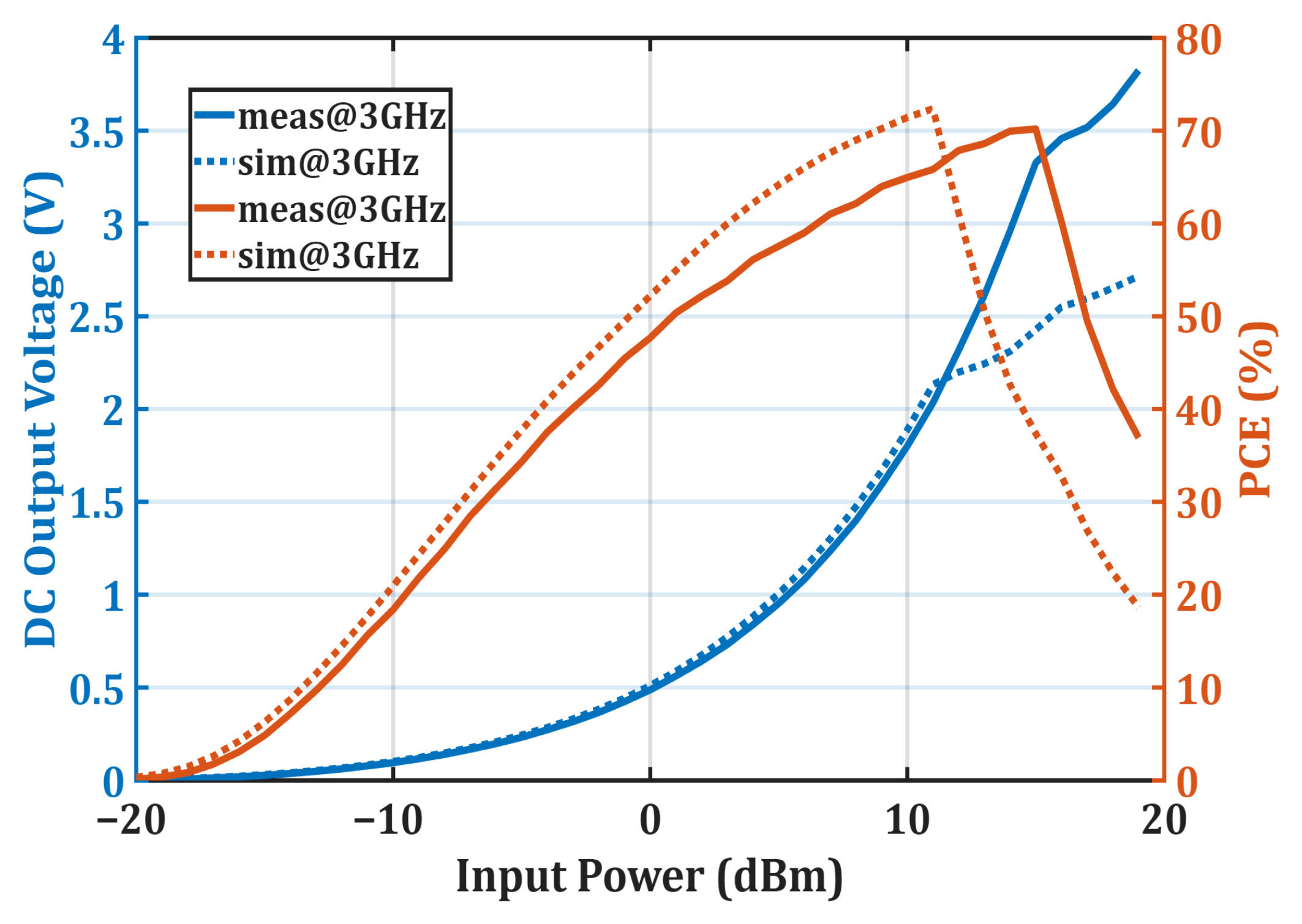 out and a rapid decrease in PCE. According to the measurement results, the diode saturation point occurred at a higher input power value than in the simulations. This difference is primarily due to the diode model used in the simulation having a lower breakdown voltage (V