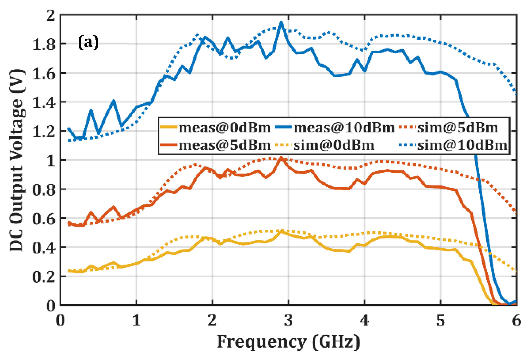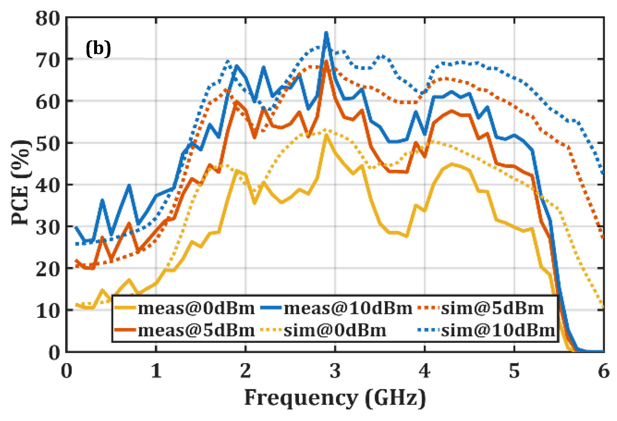 Figure 9b, and it is seen that at an input power of 10 dBm and a frequency of 2.9 GHz, the maximum PCE is 72.8% in simulations and 76.4% in measurements. Additionally, the measurement results show that a PCE above 60% is observed in the frequency ranges 1.8–3.3 GHz and 4.1–4.5 GHz at 10 dBm input power. The measurements also demonstrate that PCE remains above 50% over the wide bandwidth from 1.6 GHz to 5.1 GHz at 10 dBm input power.