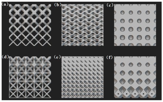 Common gradient lattice structures: (a) BCC structure; (b) gyroid structure; (c) Neovius structure; (d) FCC structure; (e) diamond structure; (f) Schwarz structure.