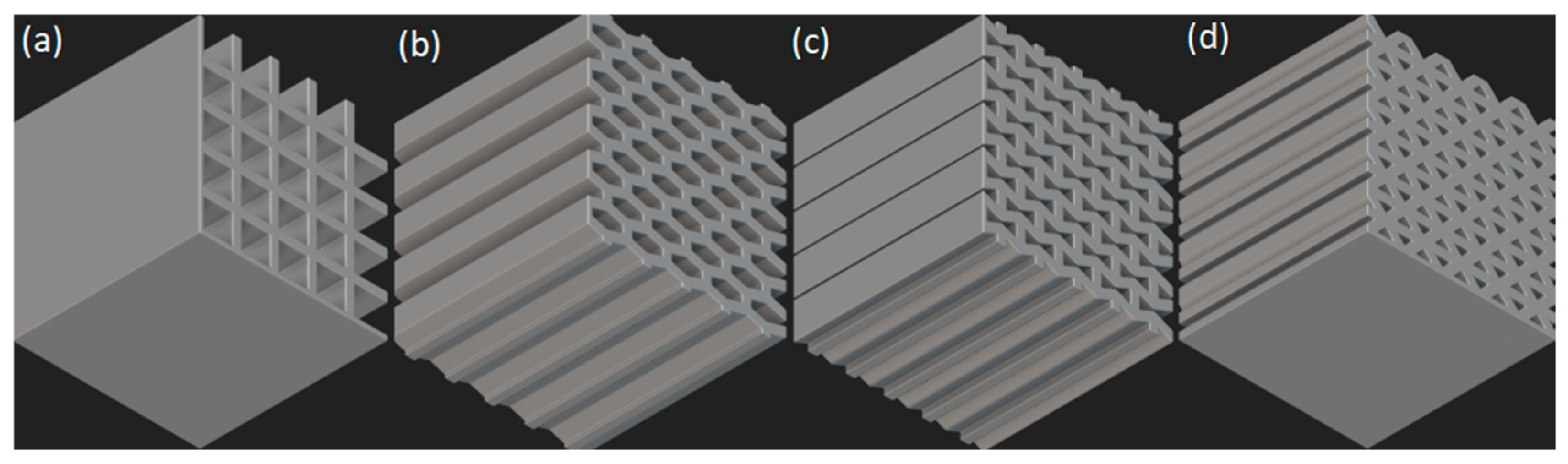 - Maloney, K.J.; Fink, K.D.; Schaedler, T.A.; Kolodziejska, J.A.; Jacobsen, A.J.; Roper, C.J. Multifunctional heat exchangers derived from three-dimensional micro-lattice structures. Int. J. Heat Mass Transf. 2012, 55, 2486–2493. [Google Scholar] [CrossRef]