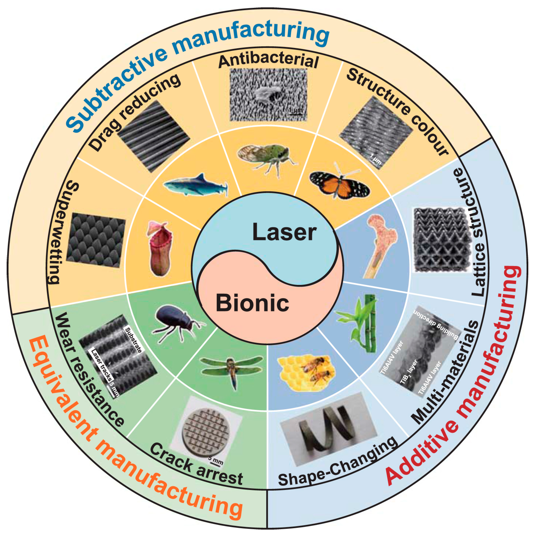 - Li, X.; Zhang, B.; Jakobi, T.; Yu, Z.; Ren, L.; Zhang, Z. Laser-based bionic manufacturing. Int. J. Extrem. Manuf. 2024, 6, 042003. [Google Scholar] [CrossRef]