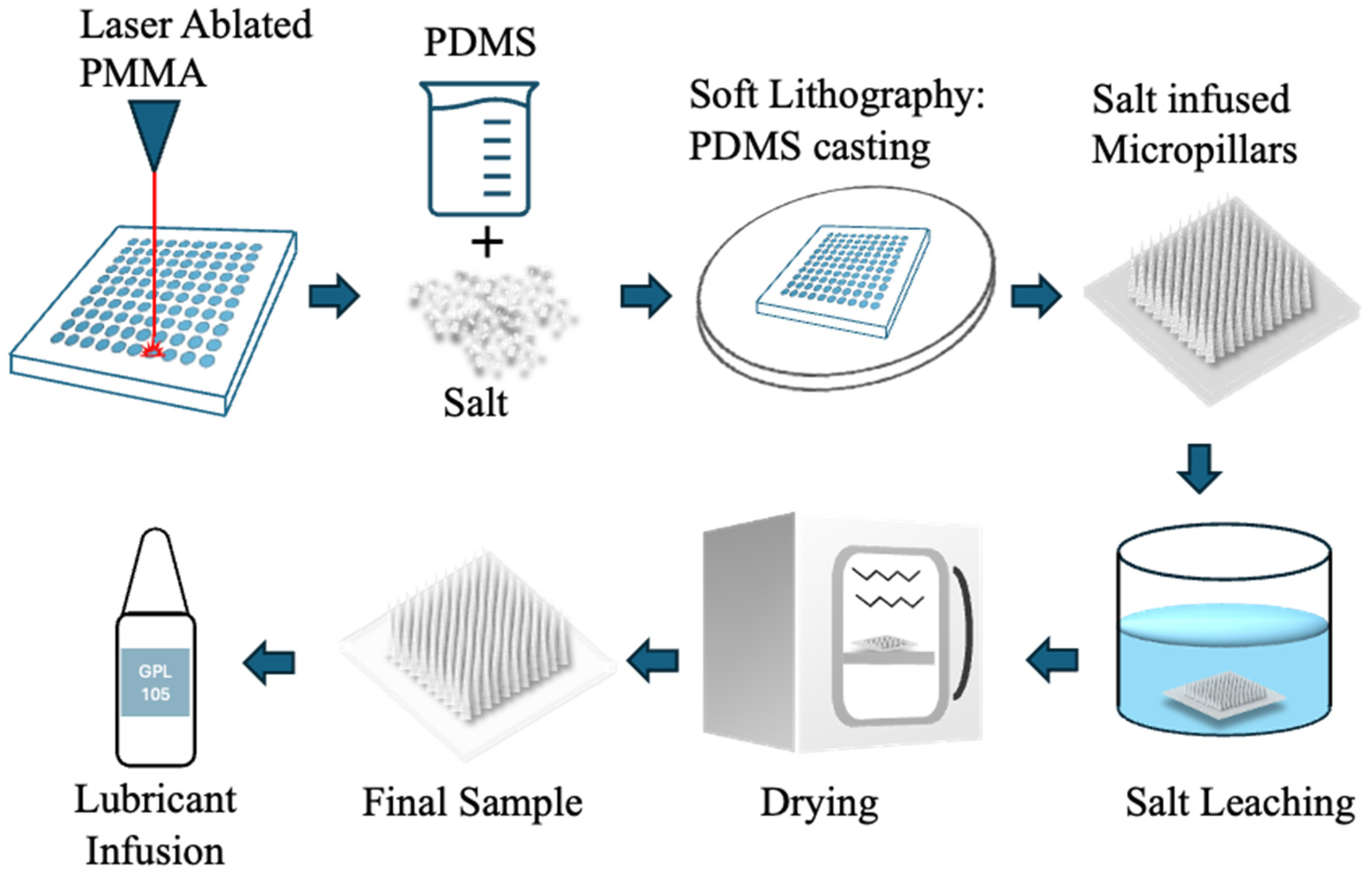 Vacuum-assisted infusion was used to introduce oil into the micropores. Krytox GPL 105 (perfluoropolyether, PFPE) (Chemours Company, Wilmington, DE, USA) was selected for its weak interactions with PDMS relative to hydrocarbon or silicone oils, its extremely low vapour pressure, its high chemical stability, and its omniphobic characteristics. For the infusion process, the micropillar substrates were fully submerged in PFPE oil and subjected to two vacuum–release cycles. After air bubbles were no longer observed during vacuuming, excess oil trapped between the micropillars was gently removed by blowing air across the surface. The substrates were then held vertically to allow remaining excess oil to drain under gravity, with a gentle air stream applied to accelerate the removal process.