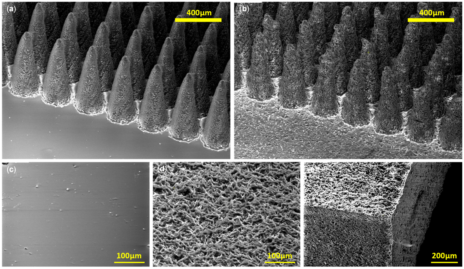 Figure 2a shows the non-porous micropillars, fabricated using the laser-machined PMMA mould.