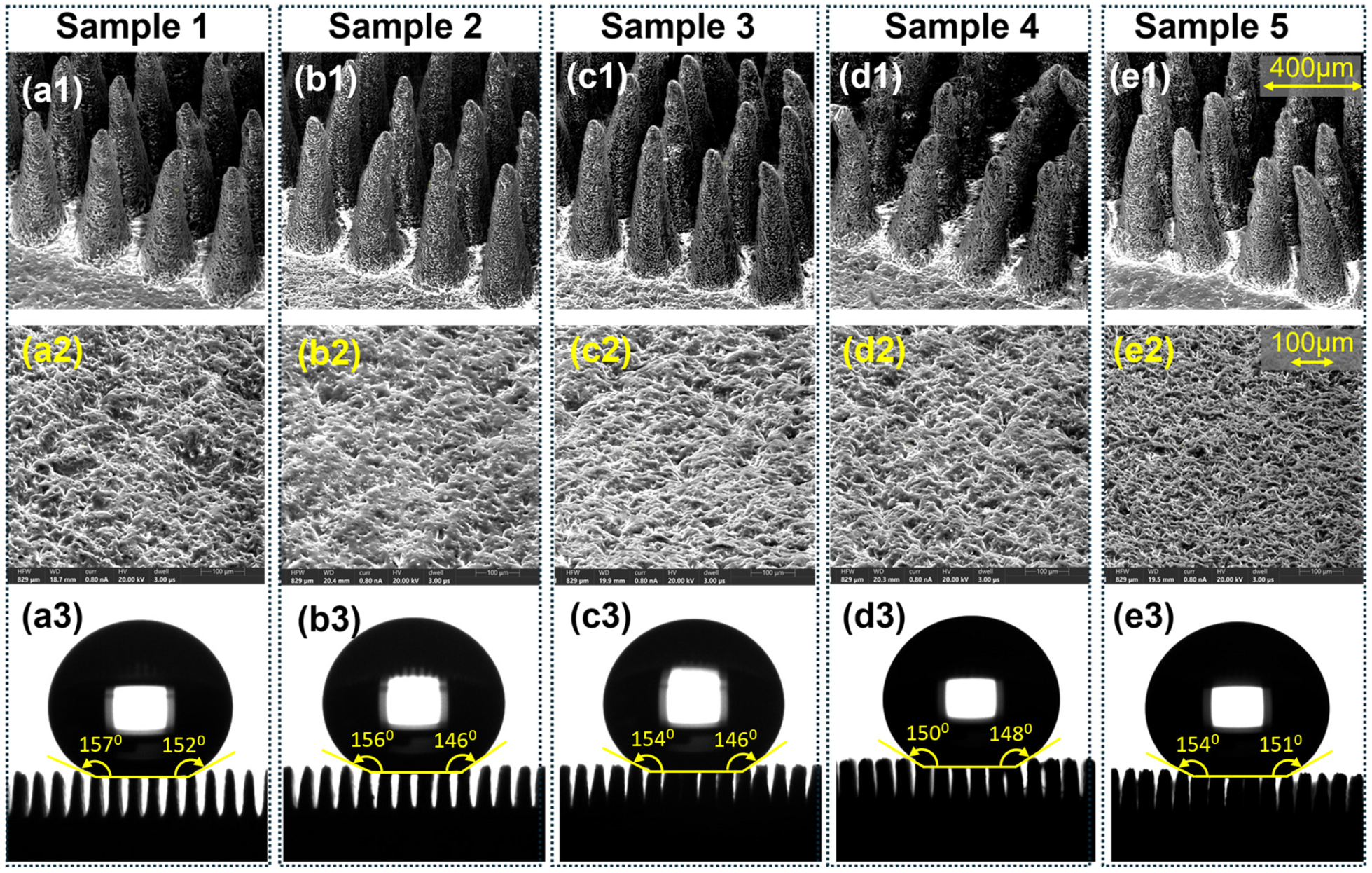 Figure 5 shows the micropillar morphology, surface porosity, and corresponding droplet profiles for Samples 1–5. It confirms the Cassie–Baxter wetting state prior to quantitative wettability analysis.