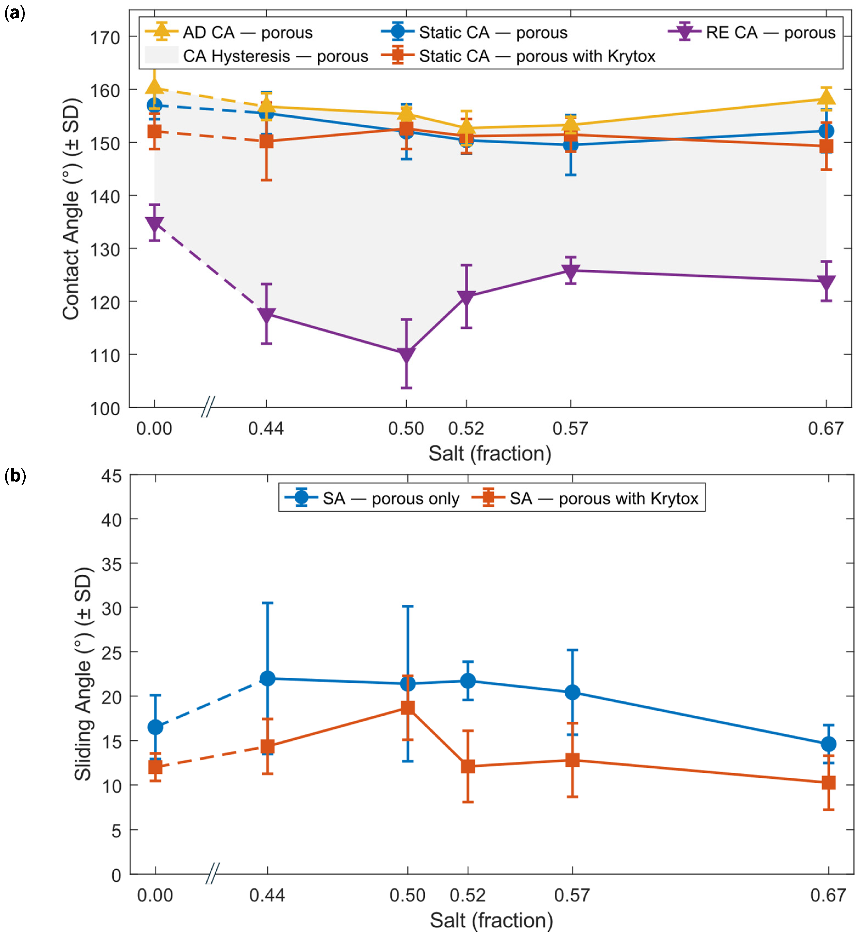 For the highest salt fraction (0.57–0.67), the apparent contact angle increased slightly, and the sliding angle decreased. This likely results from the formation of smaller pores in the 67 wt% sample (Sample 5), which may not fully wet at the pillar tips, permitting a partial Cassie–Baxter state on the upper structures and reducing pinning.