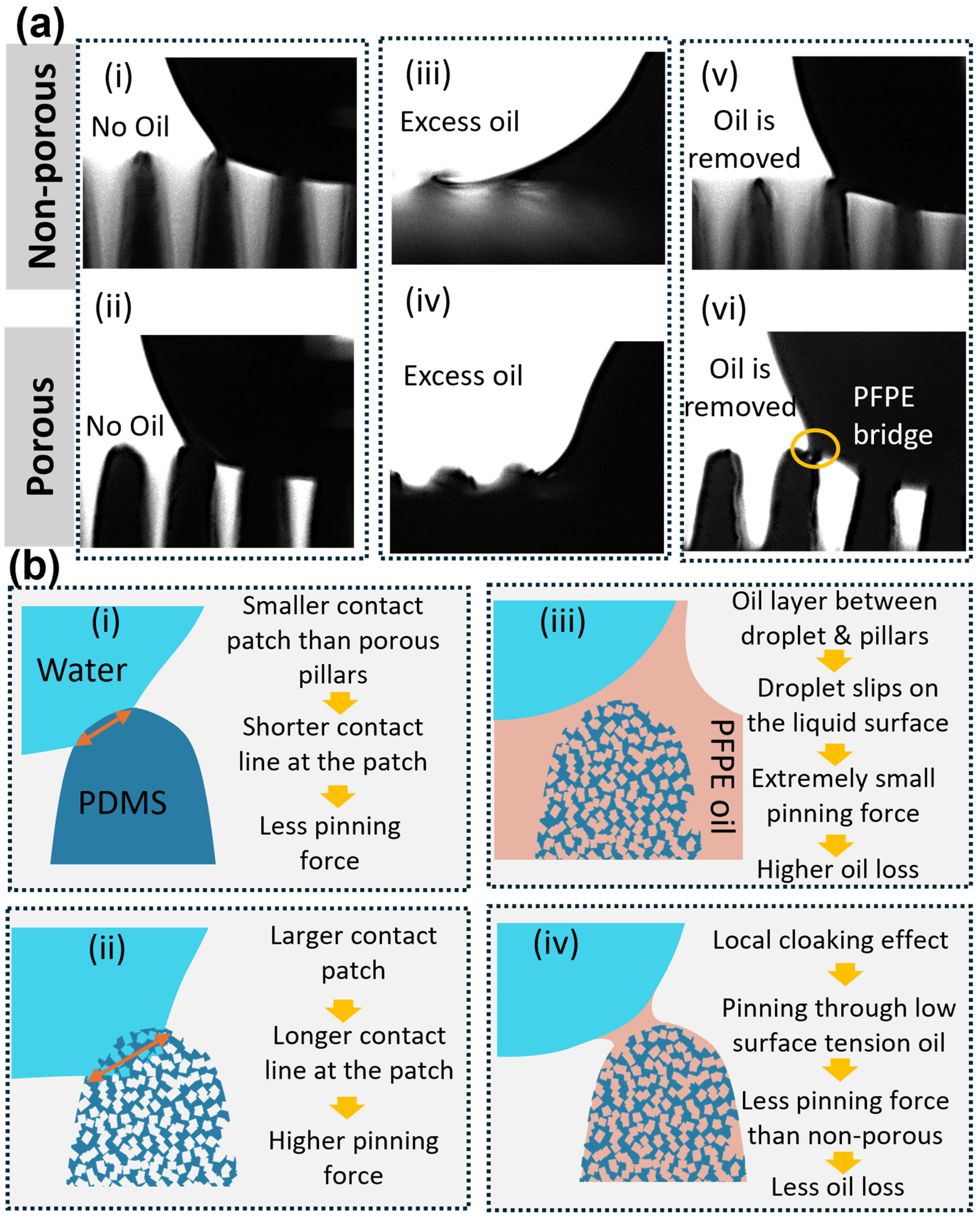 As the cloaking effect prevents contact between water and the solid surface, the remaining excess PFPE oil was removed, leaving the infused oil in the pores. This creates a surface that shows Cassie–Baxter wetting on a large scale while a droplet contacts micro-oil pockets on micropillar tops. This partially flattens the differences in porosity across the micropillars. As we can see in