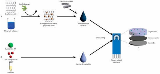 Diagrammatic representation of the electrode functionalisation protocol. (A) Graphene oxide is decorated with metal oxide nanoparticles via green synthesis and combined with carbon nanotubes to form the nanocomposite solution. (B) CypExpress 2B6, gold nanoparticles and chitosan (1%) are combined to form the enzyme film solution. (C) The nanocomposite and enzyme film solutions are deposited in sequence on the working electrode surface by drop-casting.