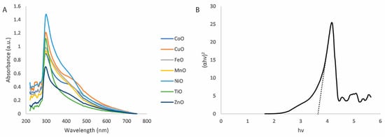 The absorption spectra for the various metal oxide nanoparticle dispersions are shown in Figure 2A. In each case, there is a clear absorption peak at approximately 300 nm. The bandgap energies of the nanoparticles can be estimated from these absorption spectra using the Tauc method [51,52]. The optical absorption strength is provided by the following:
