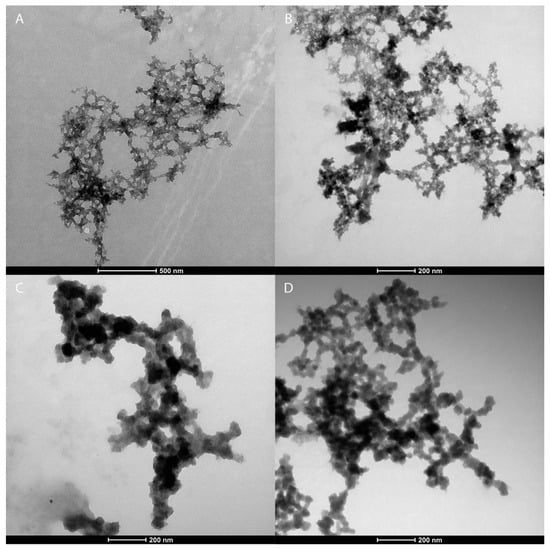 Transmission electron microscopy images of (A) cobalt oxide nanoparticles, (B) titanium oxide nanoparticles, (C) copper titanium oxide nanoparticles, and (D) zinc titanium oxide nanoparticles.