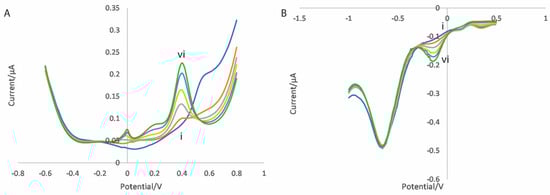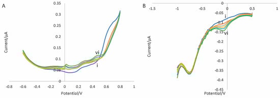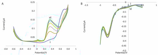 Differential pulse voltammograms for the (A) oxidation scan and (B) reduction scan for a CNT/GO/CuTiONP-nanocomposite-functionalised electrode in bovine serum with propofol concentrations of (i) 0, (ii) 2, (iii) 4, (iv) 6, (v) 8 and (vi) 10 µg/mL.