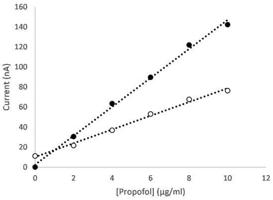 Peak current versus propofol concentration at +400 mV for the oxidation scan (black circles) and −110 mV for the reduction scan (white circles) for a CNT/GO/CoONP nanocomposite-functionalised electrode. Baseline correction has been applied.